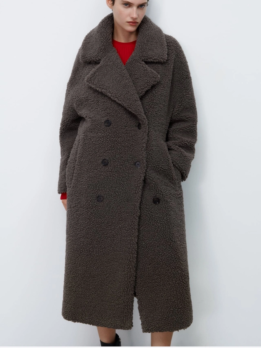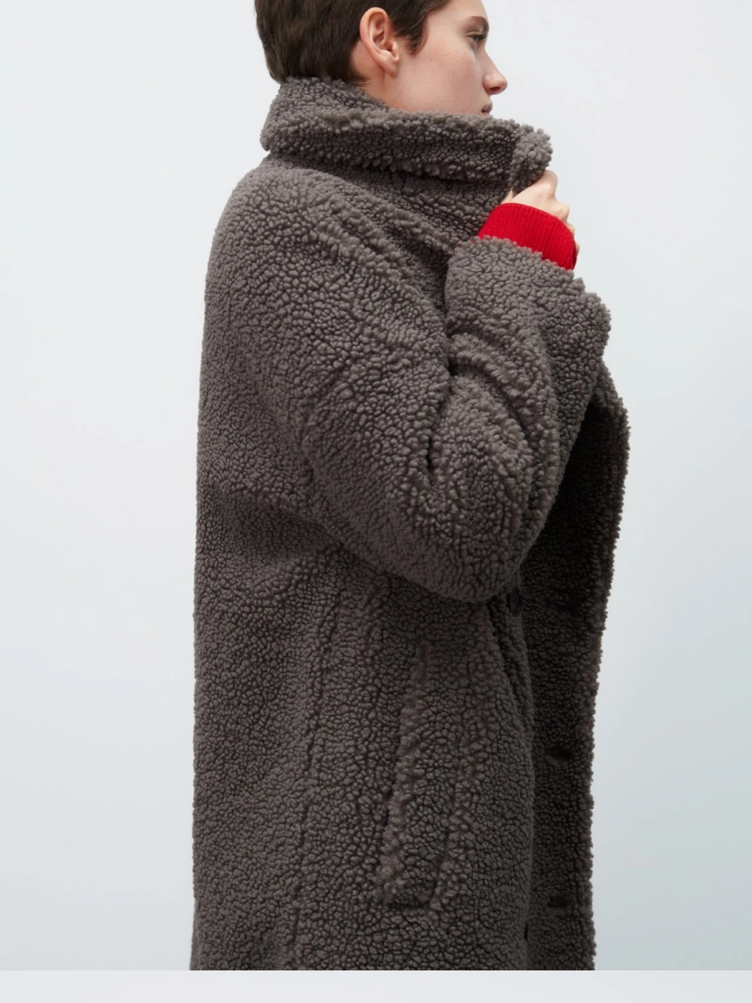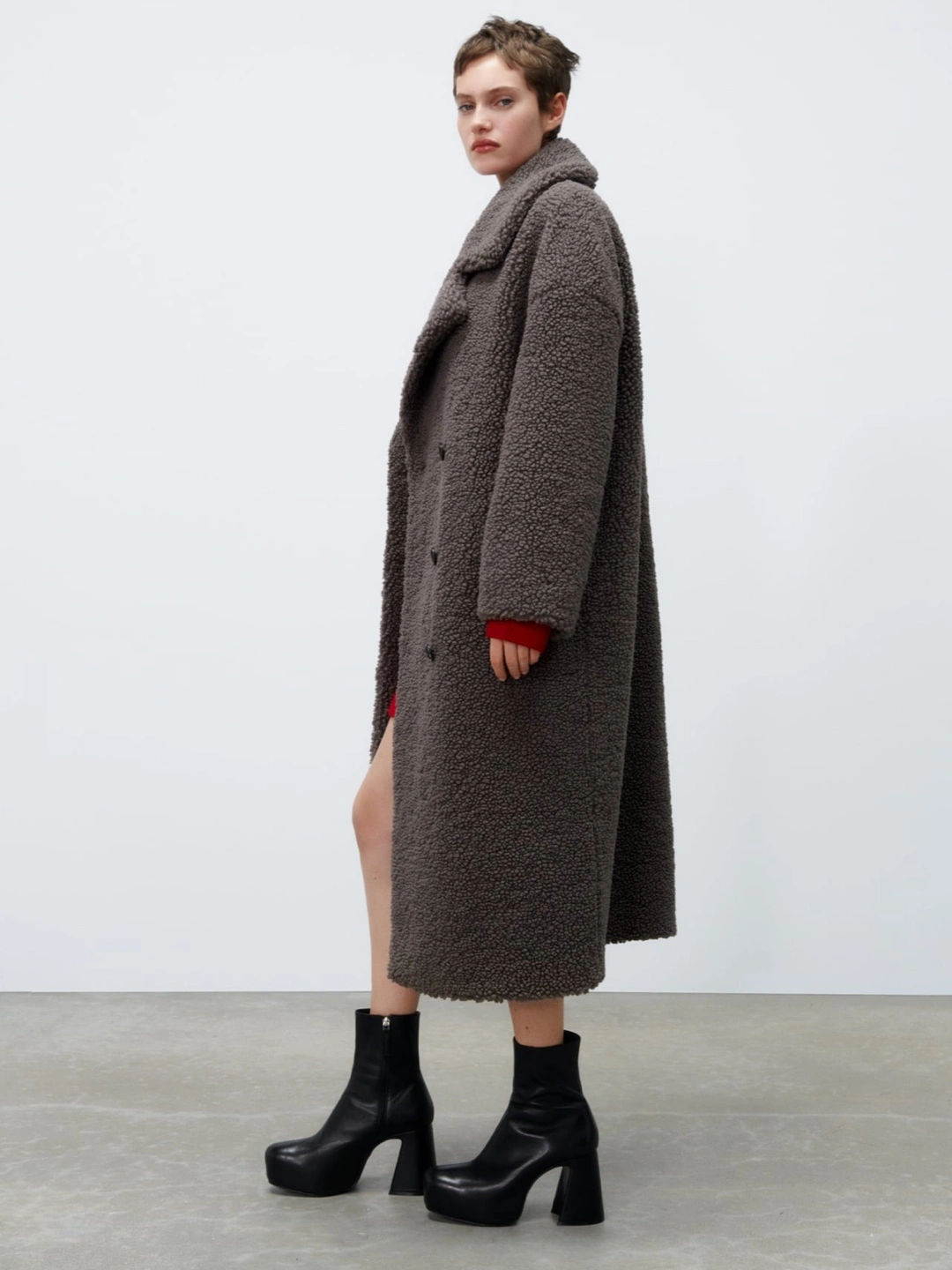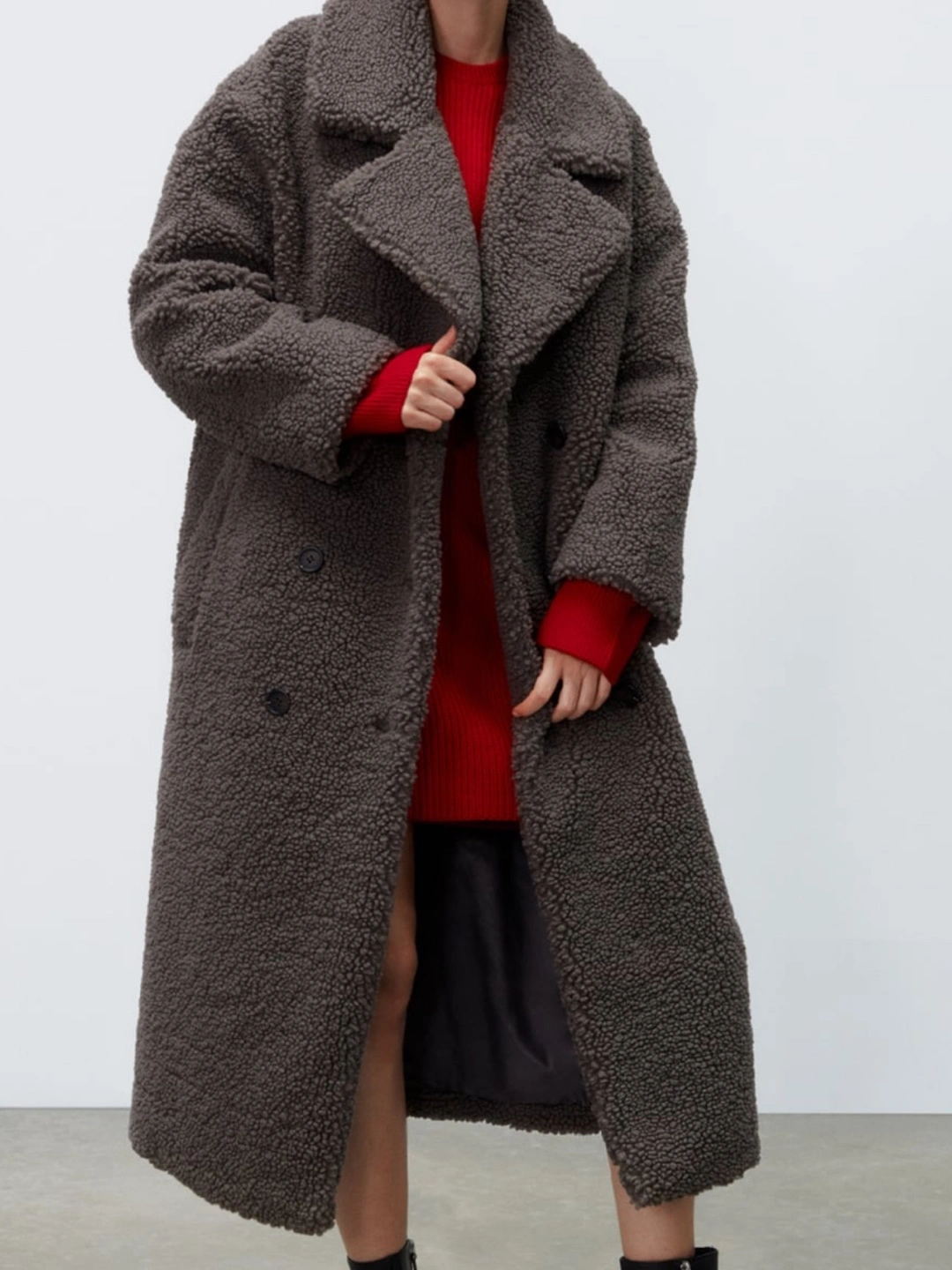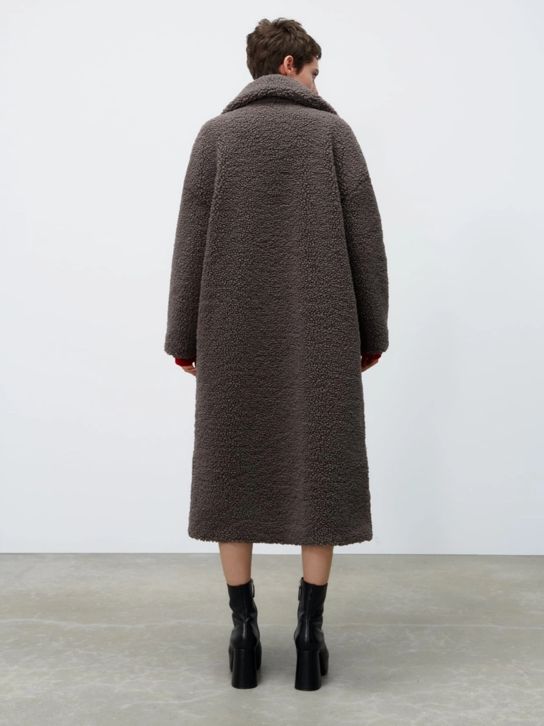 A long, grey teddy coat with a double-breasted closure. It has a collar, long sleeves and two front pockets.