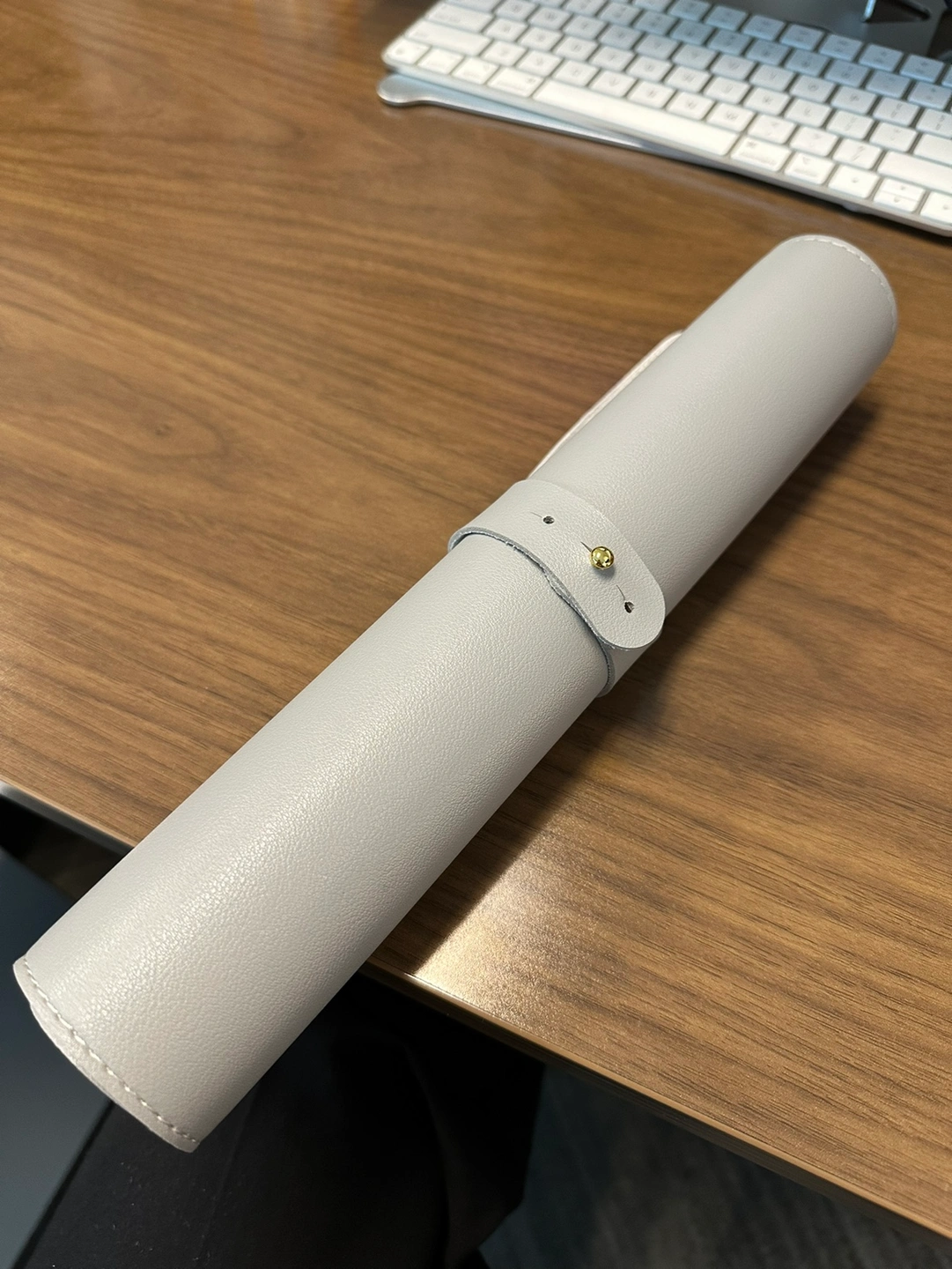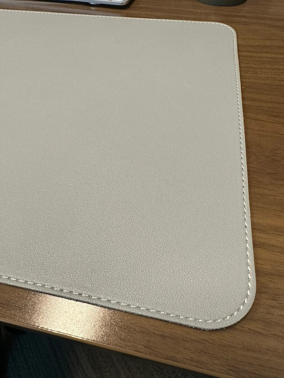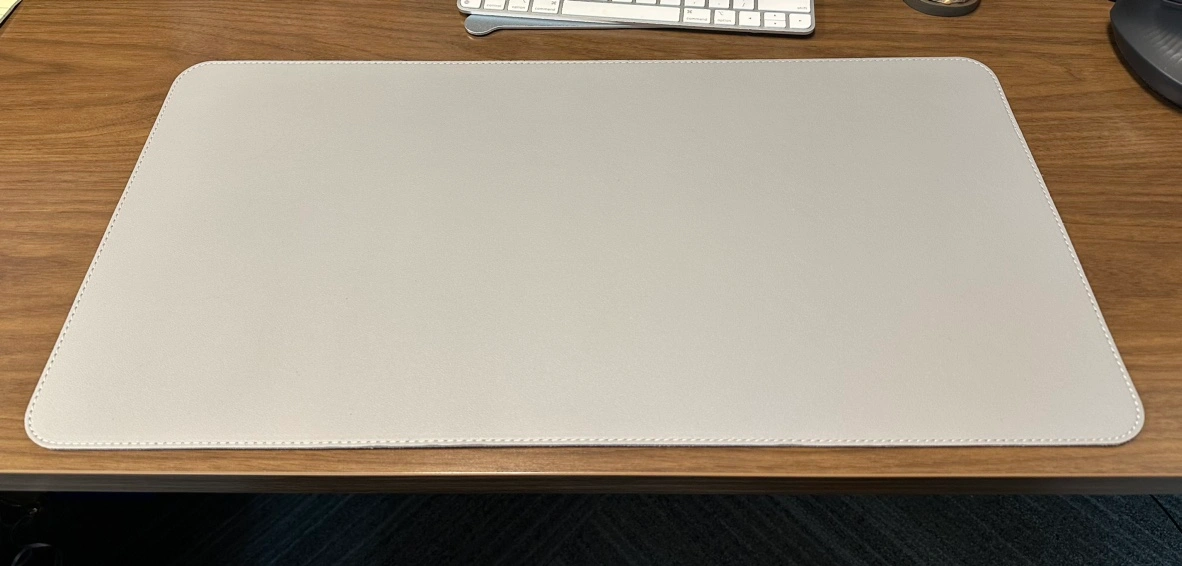 Large grey leather desk mat, can be rolled carry around. Also works as a mousepad.
