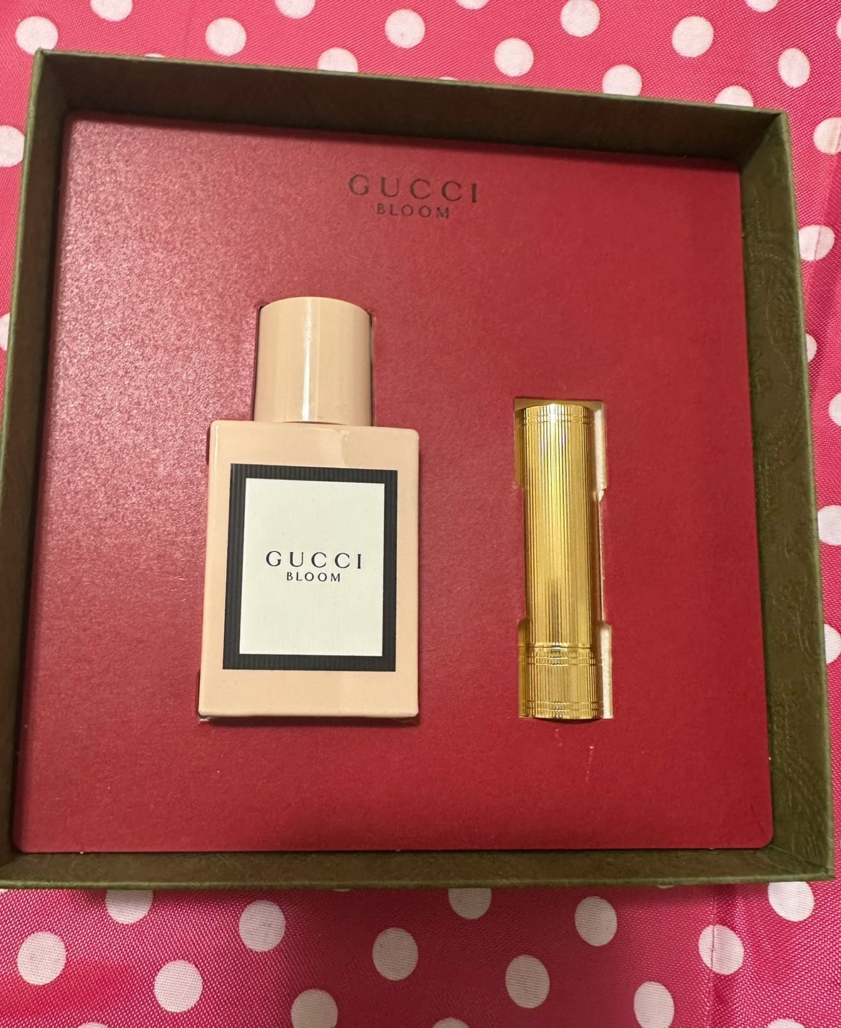 This is a beautiful set of Gucci Bloom perfume and lipstick. The perfume is 30 ml and the lipstick is 3.5 g. The set comes in a beautiful box and is perfect for a gift.