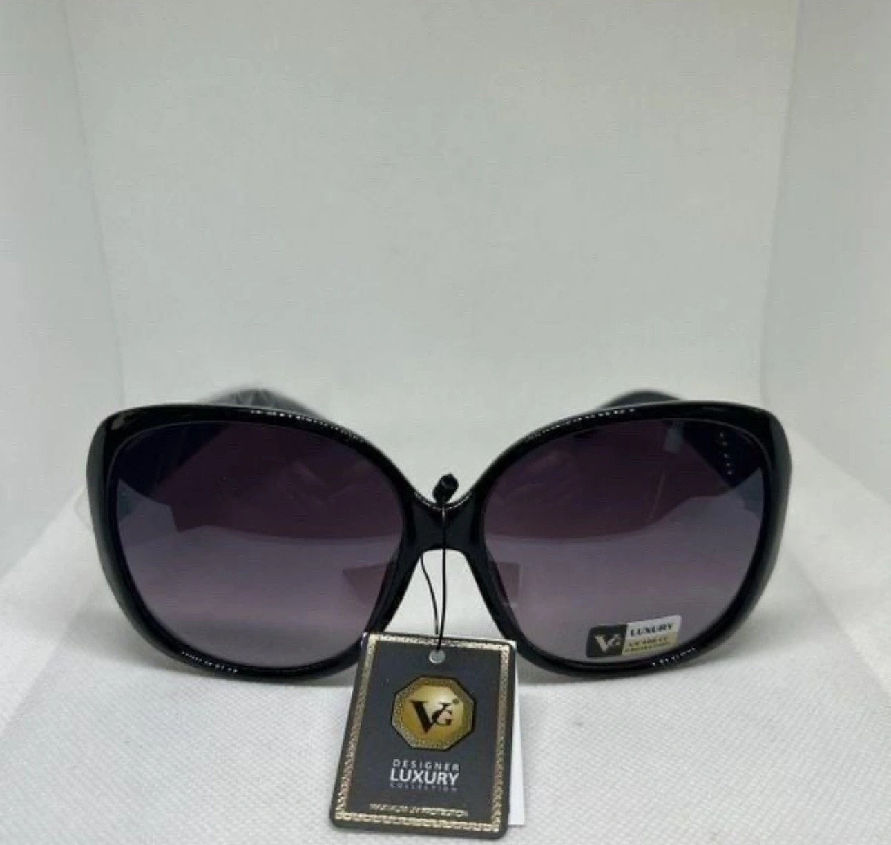 These are black sunglasses with a gold design on the temples. The sunglasses have a dark grey lens. They have a slightly oversized rectangular shape.