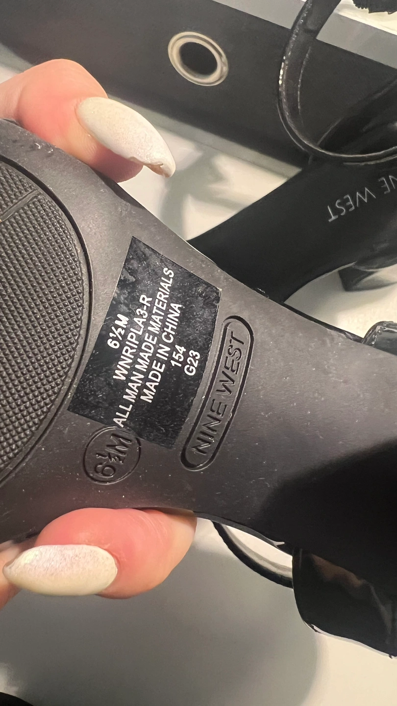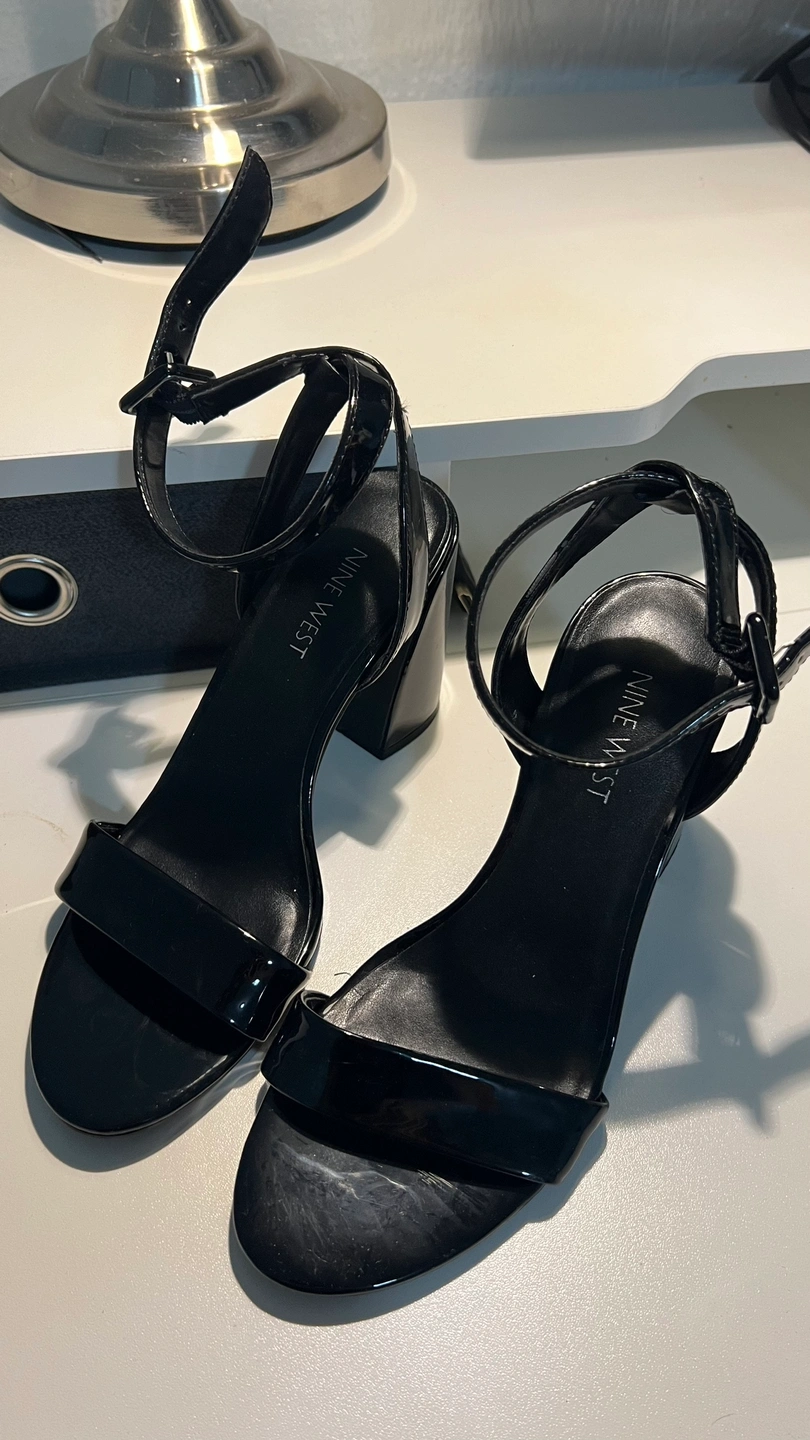 Black patent leather sandals with adjustable ankle strap. Size 6.5M. Worn only once to a heel-only event.