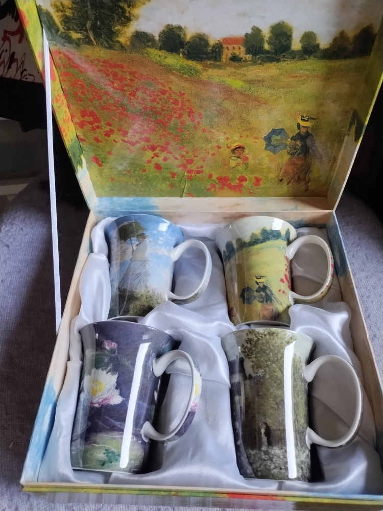 LOVELY, New boxed SET of 4 bone china mugs with beautiful Monet painting designs.