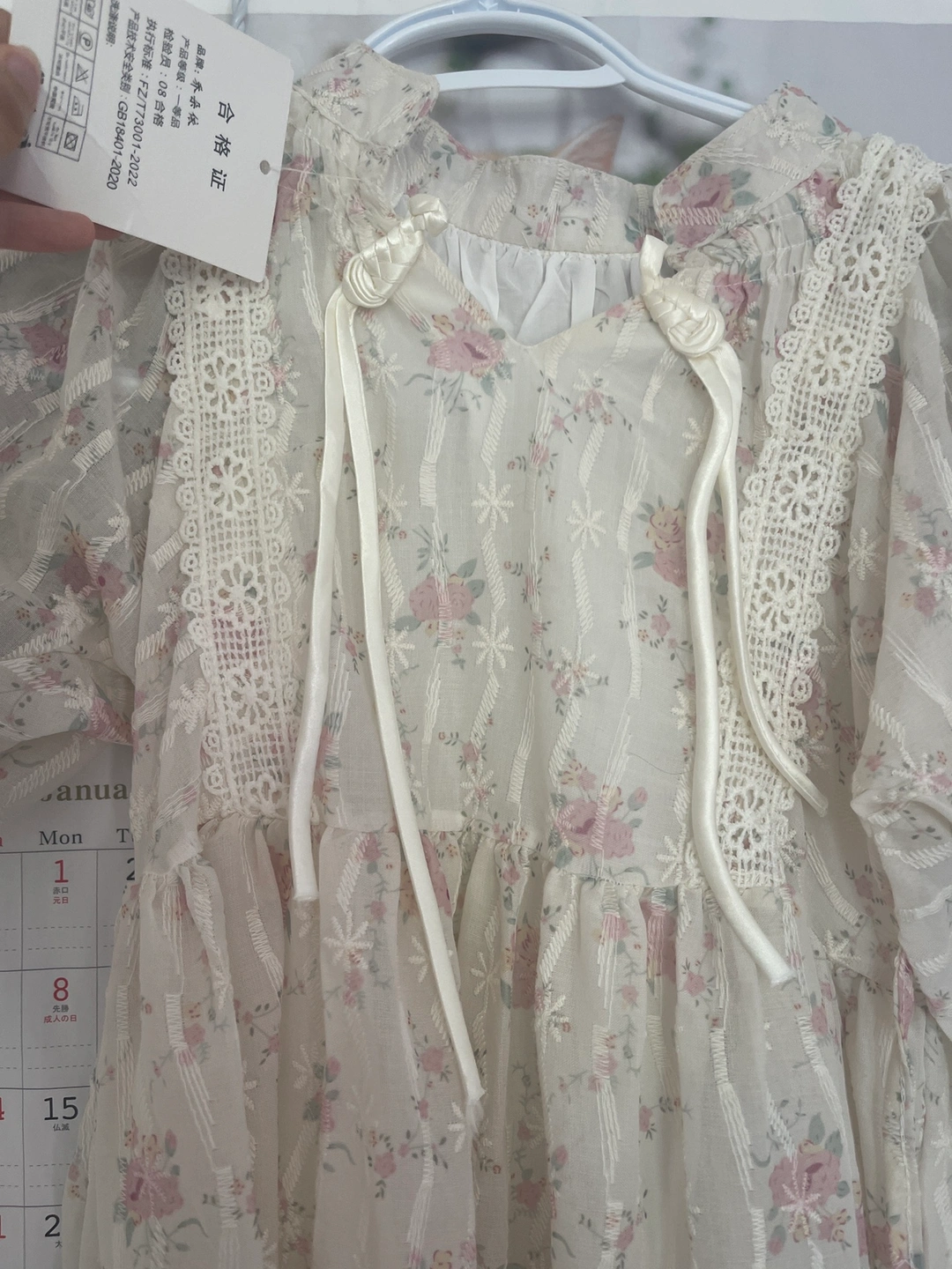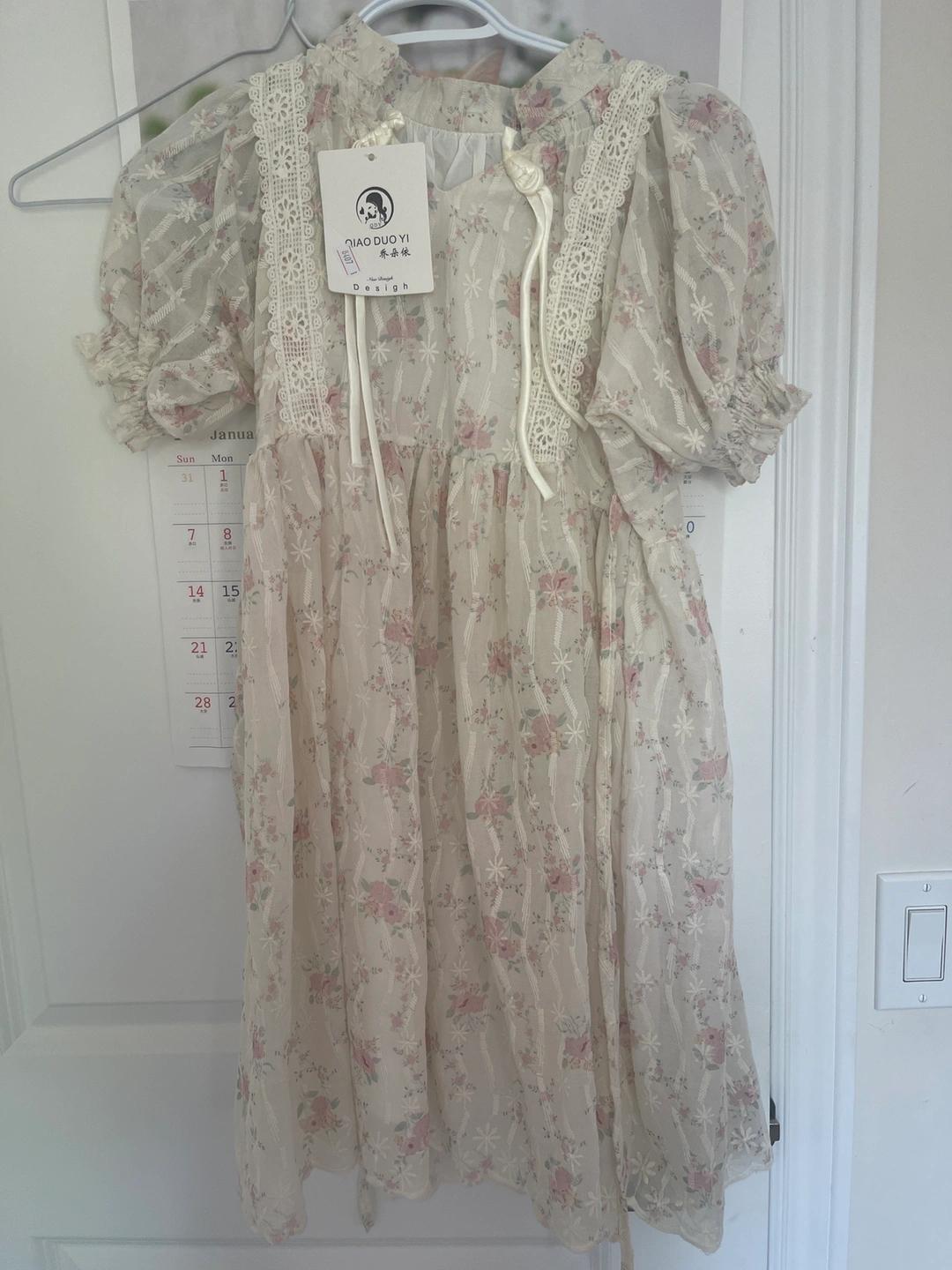 This dress is made of a sheer fabric with a floral pattern. It features short sleeves with lace trim, a V-neckline, and a tie at the neck.