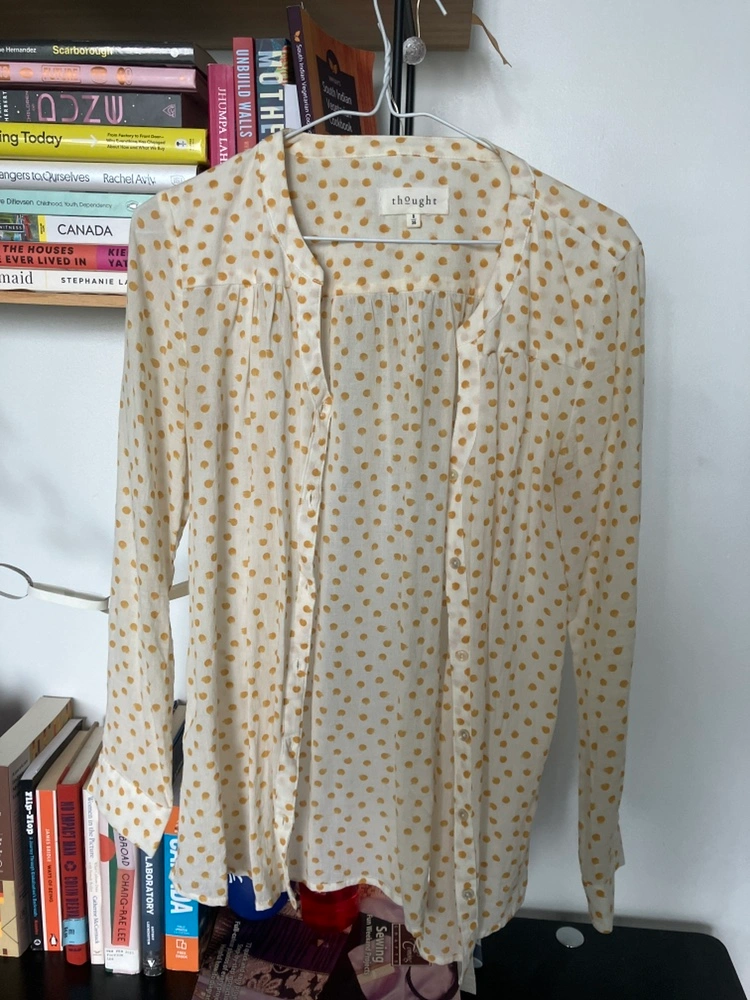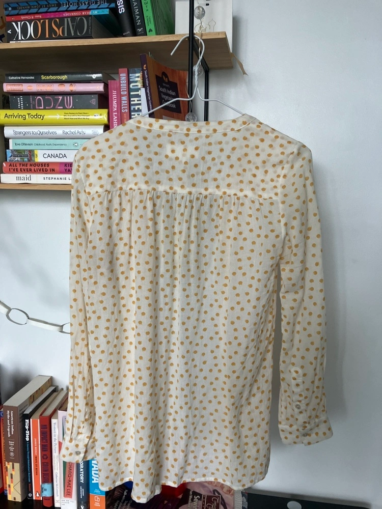 Cream polka dot blouse with mustard detail. Very chic round neckline.