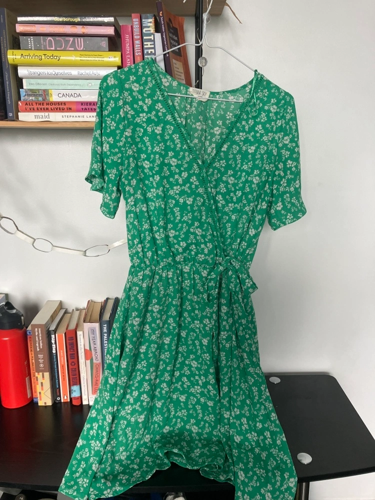 A green wrap dress with a floral pattern, short sleeves, and a tie waist. Bought secondhand and not sure about the fit on me, so I’ve barely worn it at all.