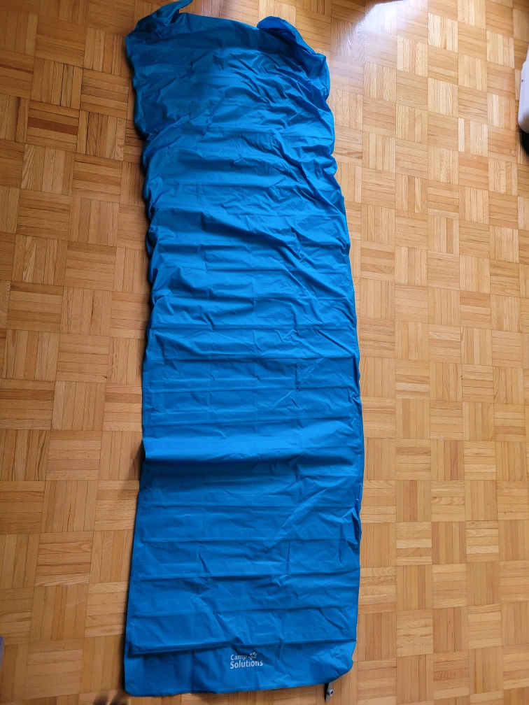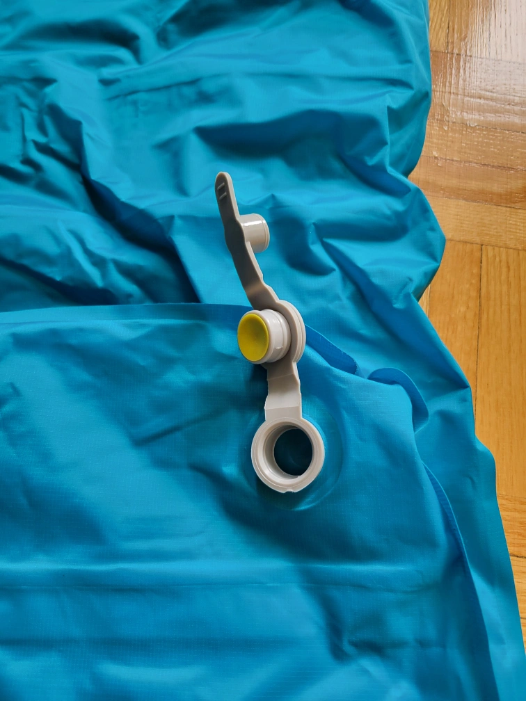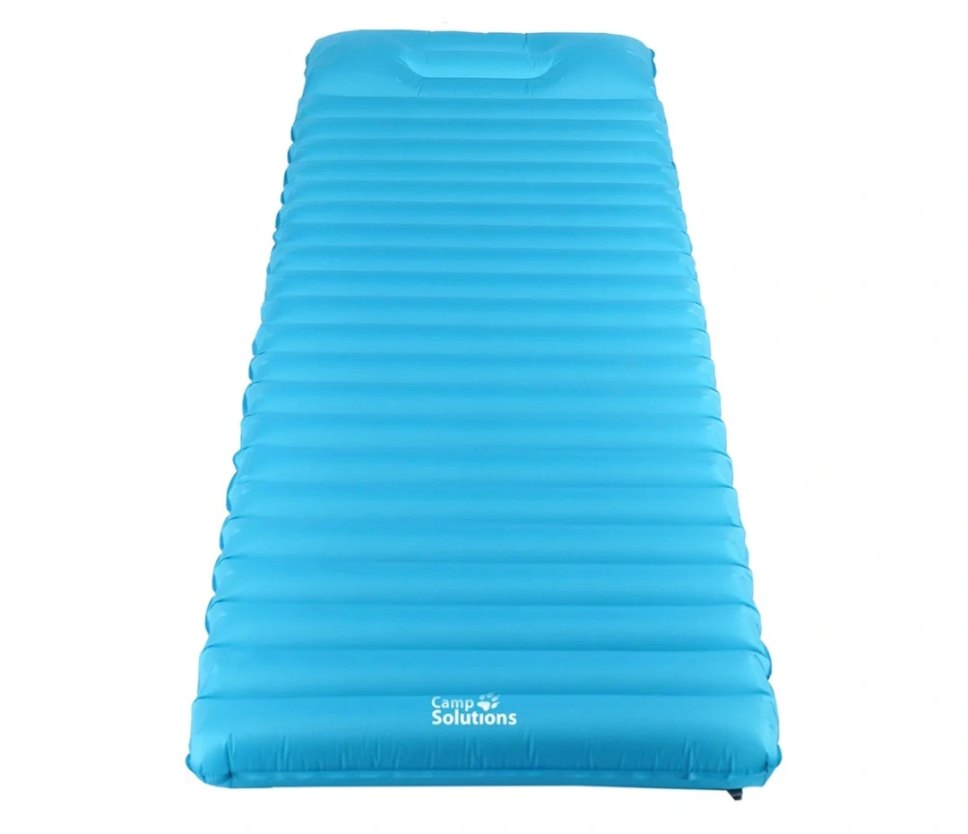 Blue inflatable mattress with a built-in pillow. It has a valve for inflating and comes with an inflating bag (no pump/electricity required). Quality material and rolls up for easy storage. The mattress measures approximately 75 inches long and 25 inches wide. Only used twice. Perfect for backcountry trips.