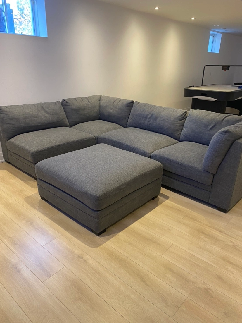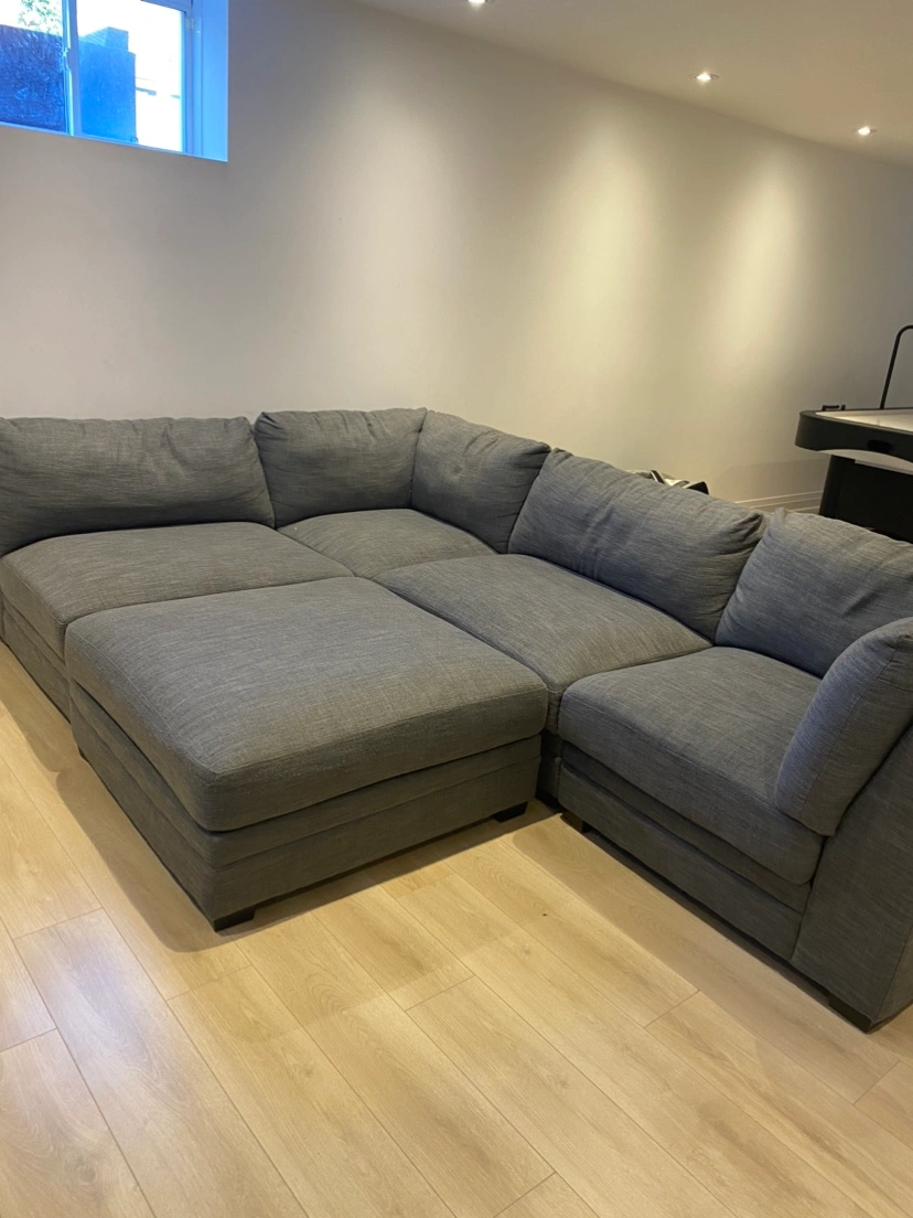 This sofa is in great condition and is a great addition to any home! It is very comfortable and is perfect for lounging. Can be made into different configurations and ottoman attaches to become a chaise lounge section. Pick up only.
