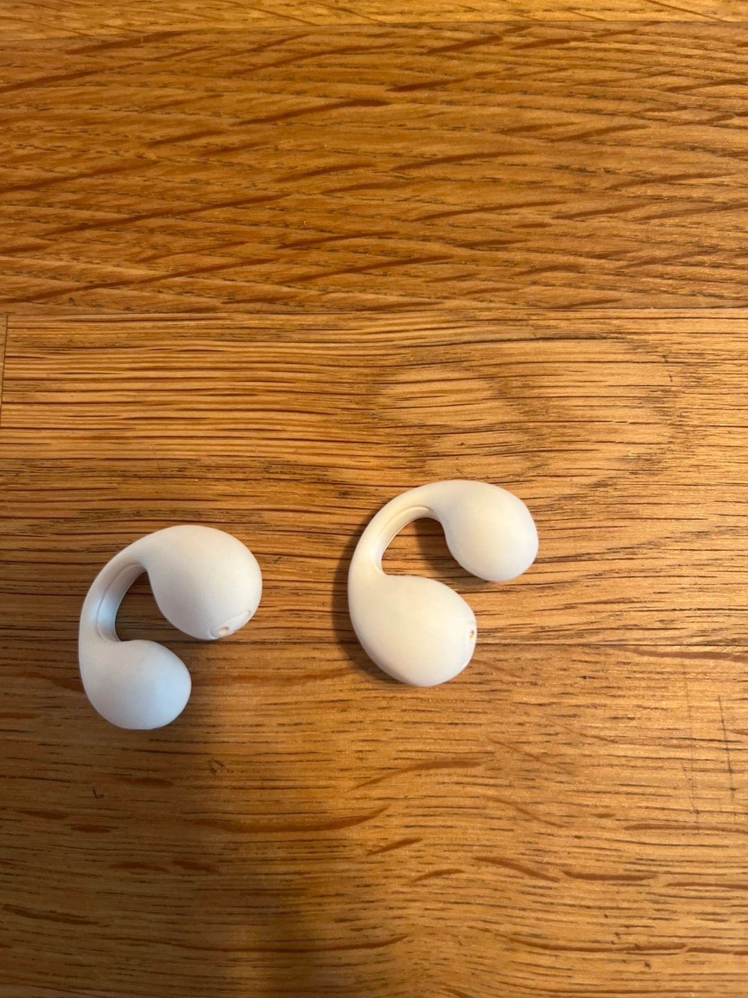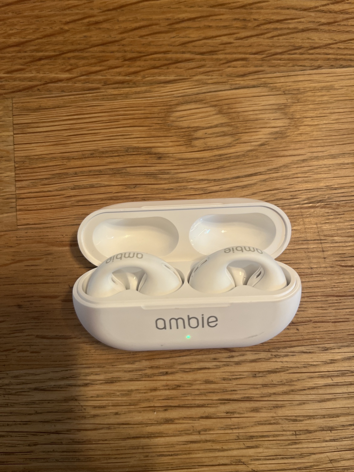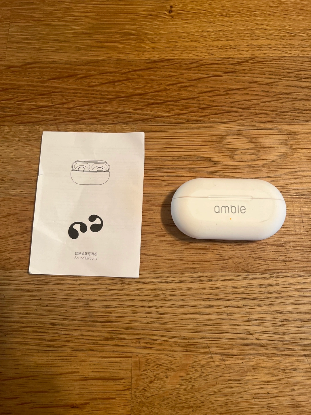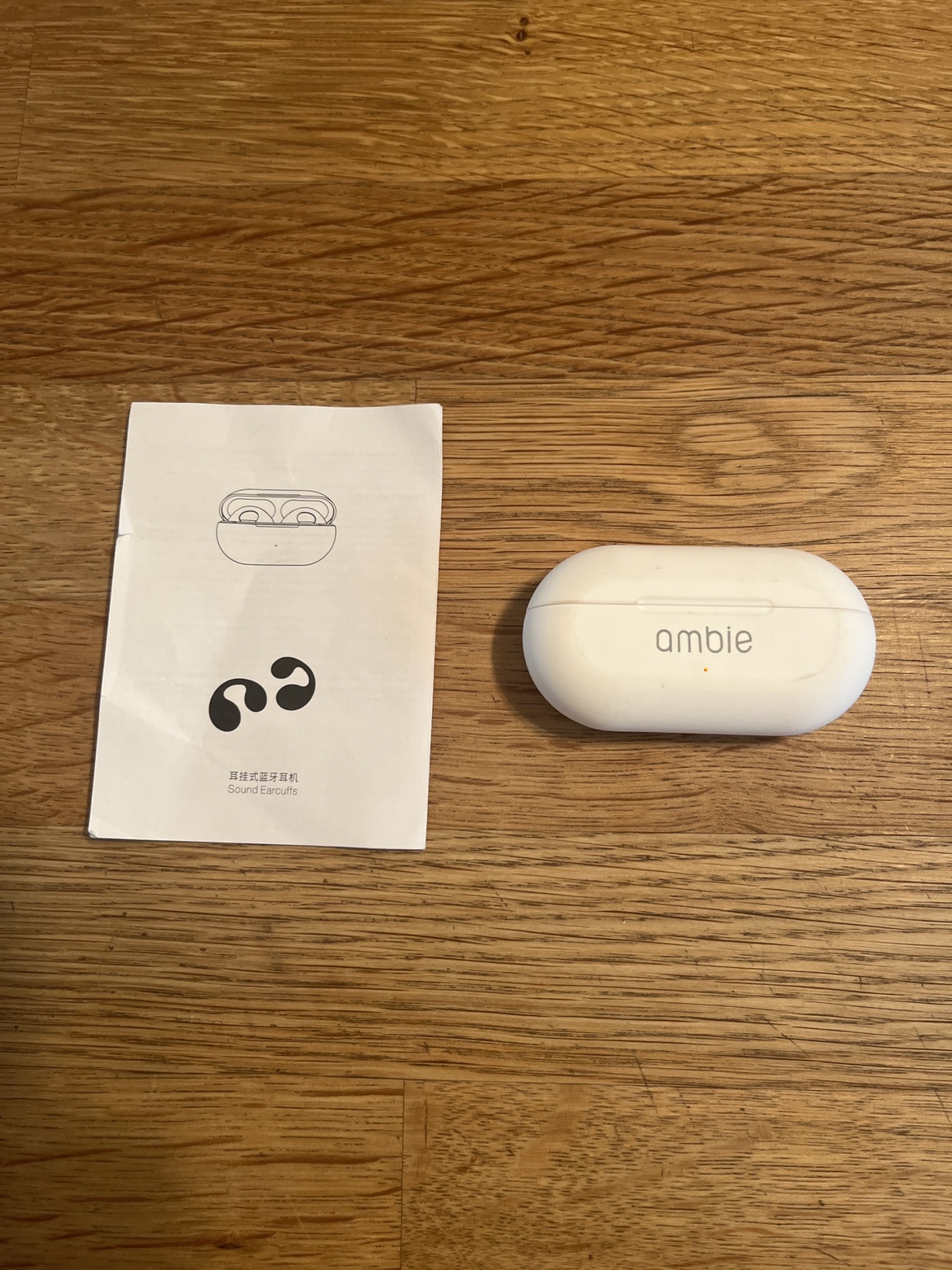 These are white Ambie Sound Earbuds with a charging case and instructions. Charger needs to be replaced but can easily be purchased.