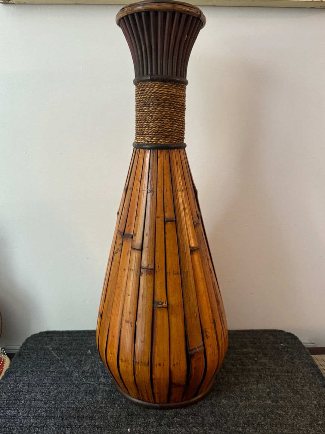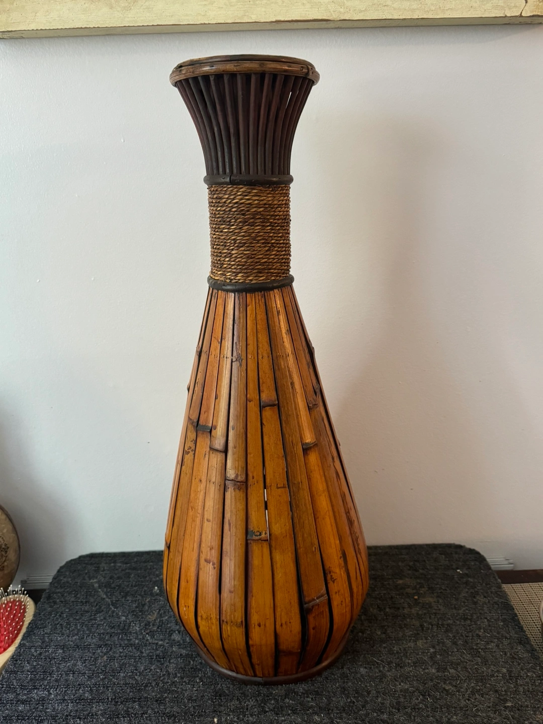 28Tall, decorative vase made of bamboo with a rope accent. Approx 20 inches tall. $35 pair