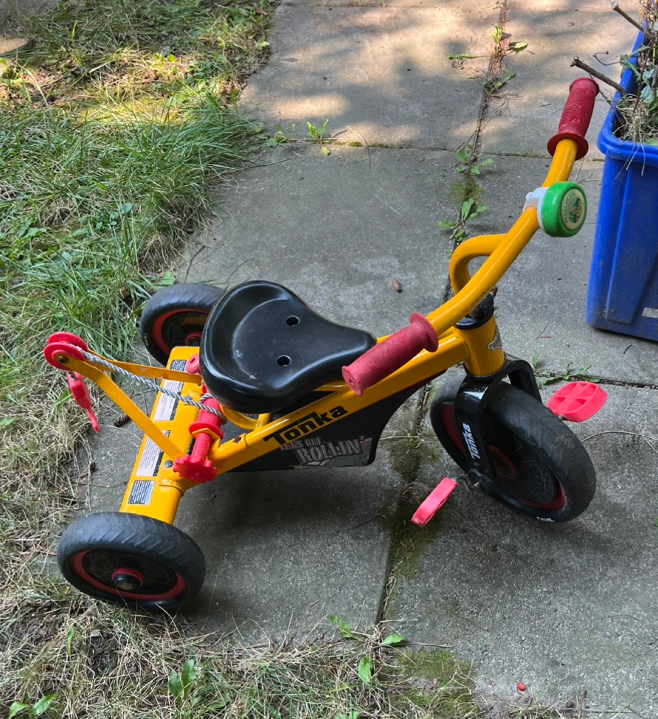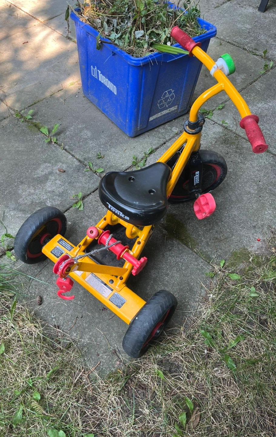 307Yellow Tonka tricycle with black wheels.