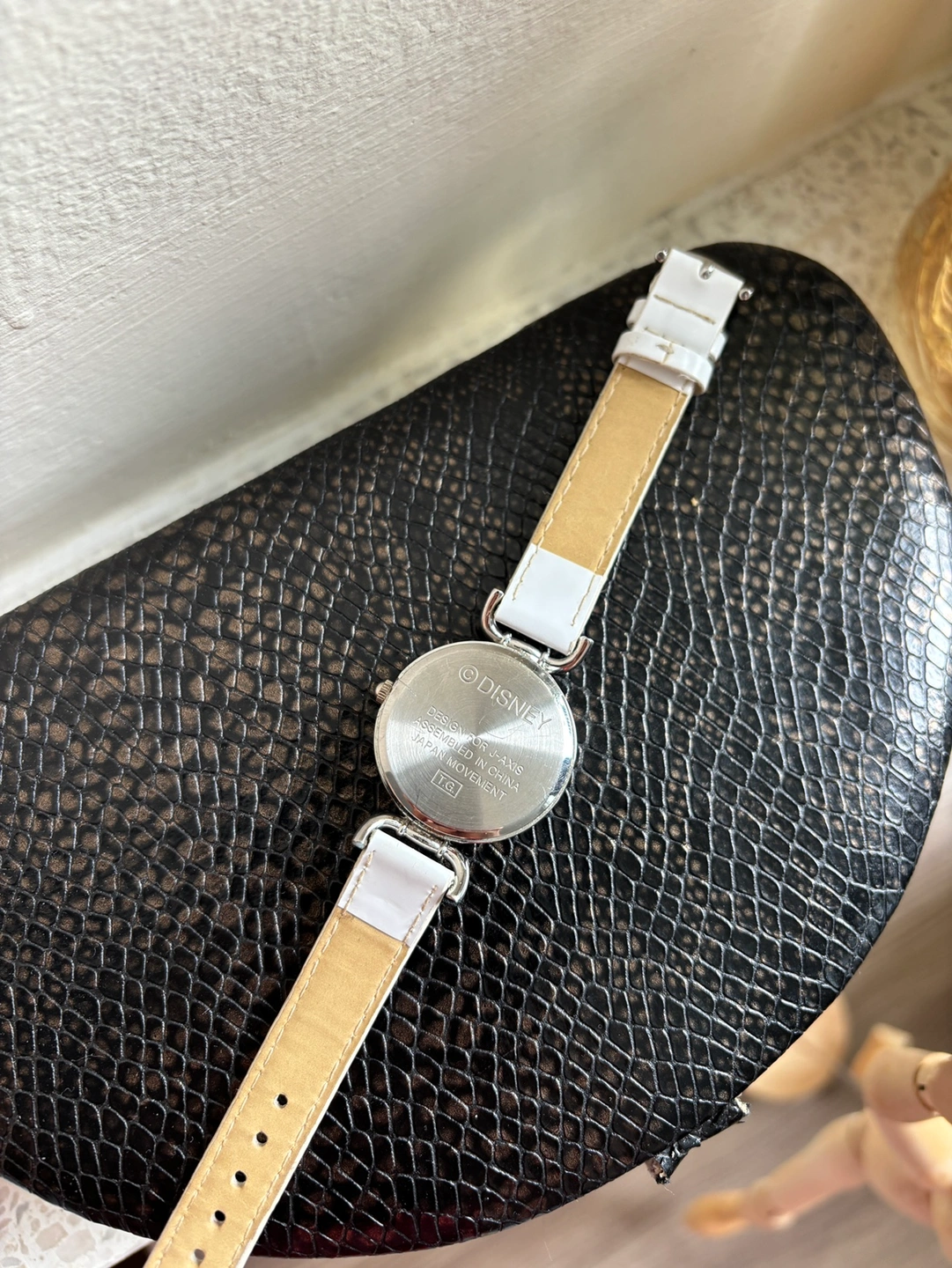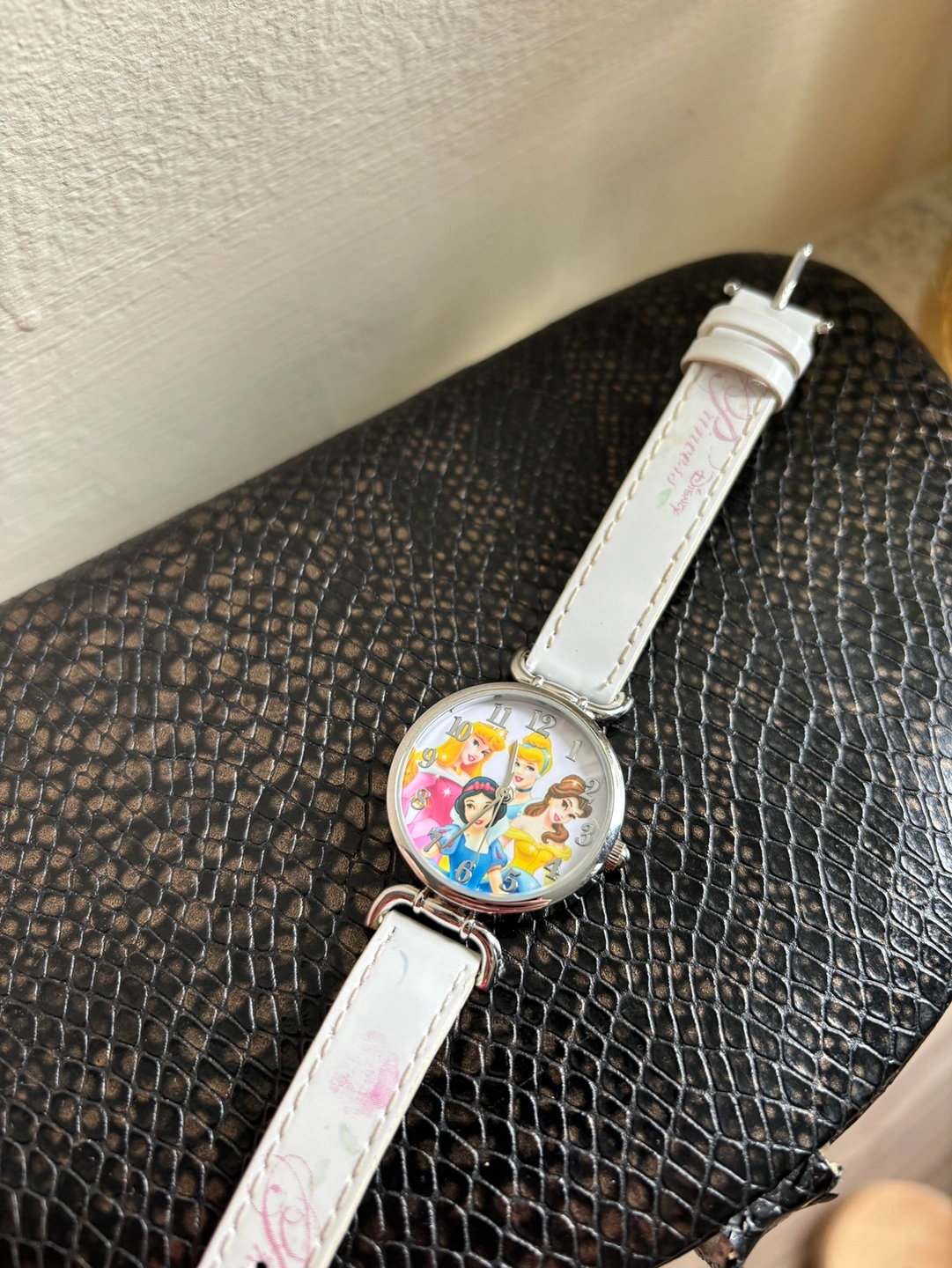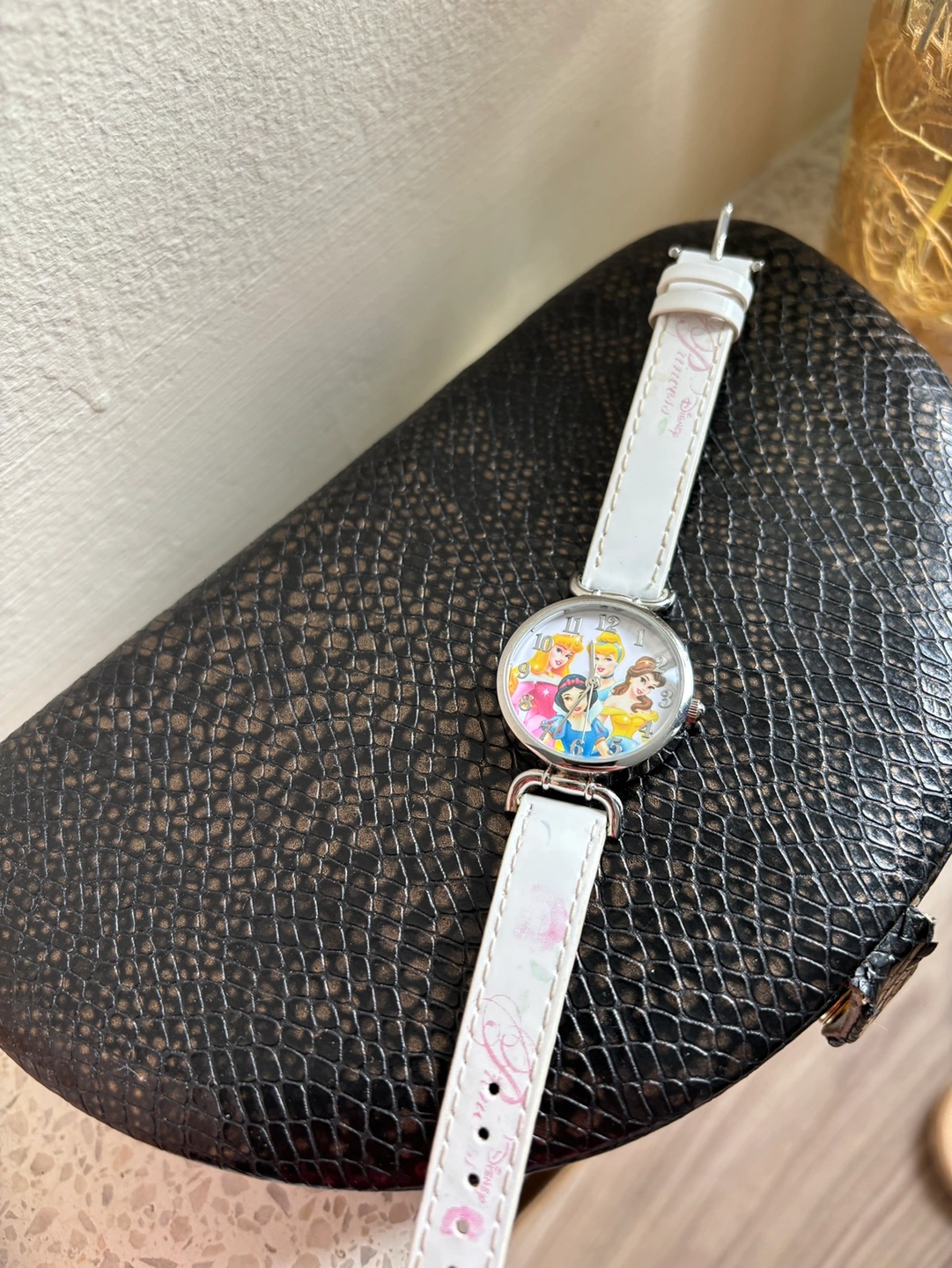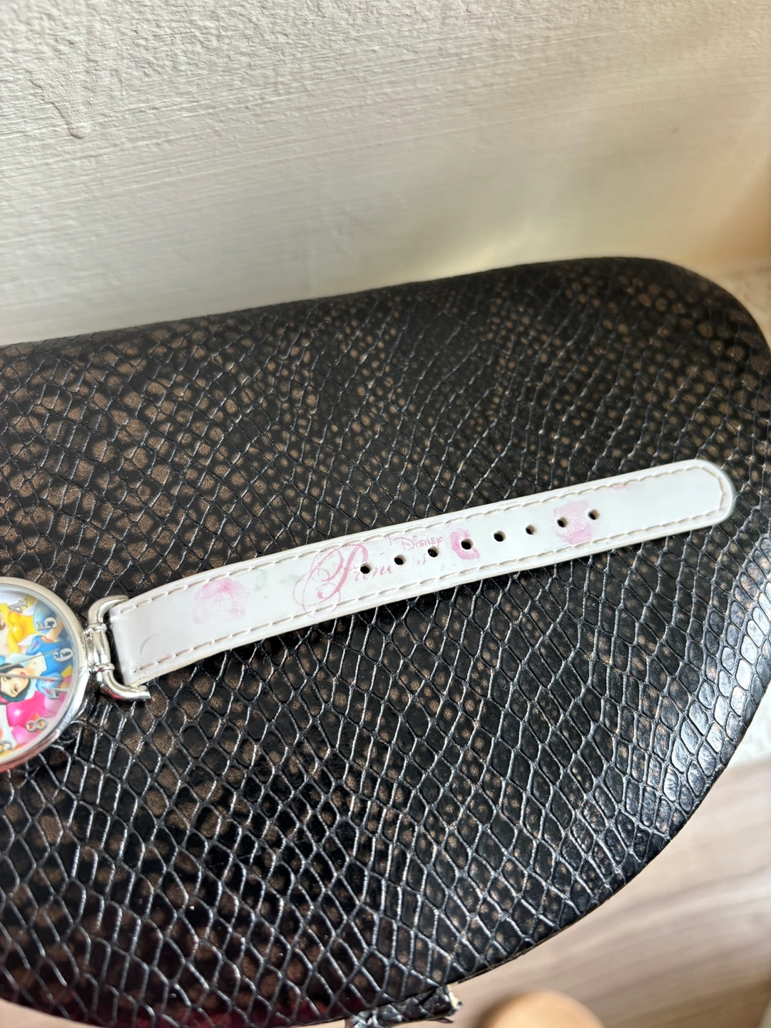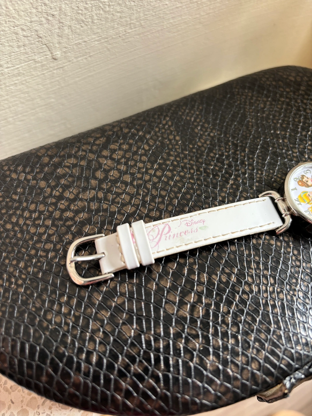 A Disney Princesses watch with a white leather band. Batteries have been replaced within the last month! Can be inspected during pickup. Please see my bio for payment and pickup details!