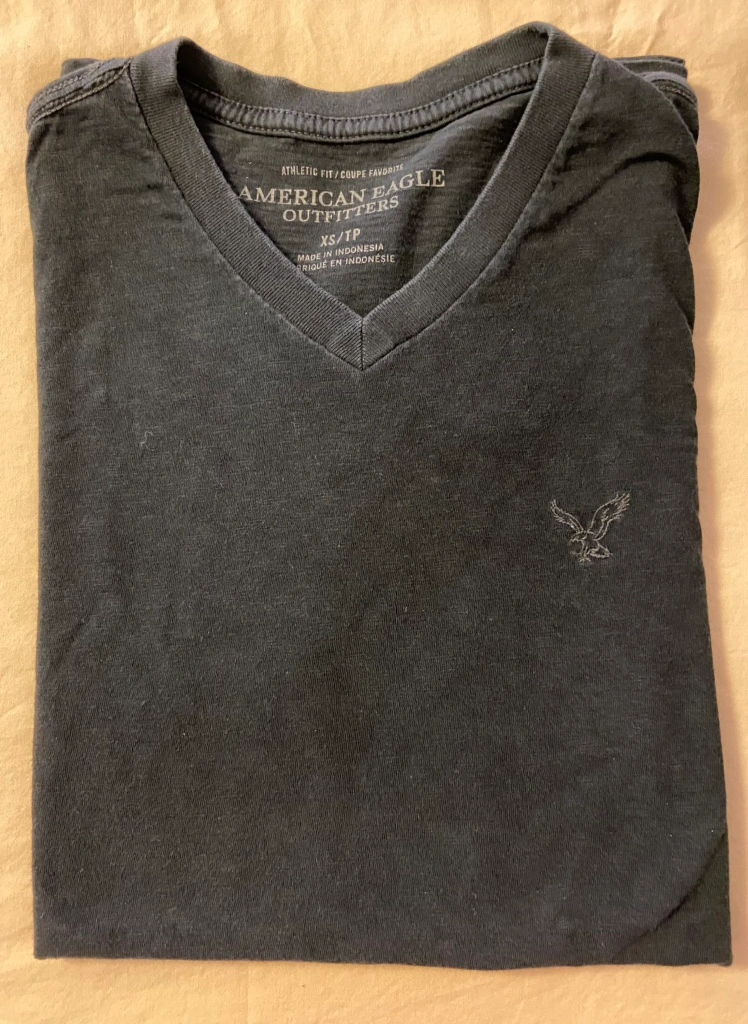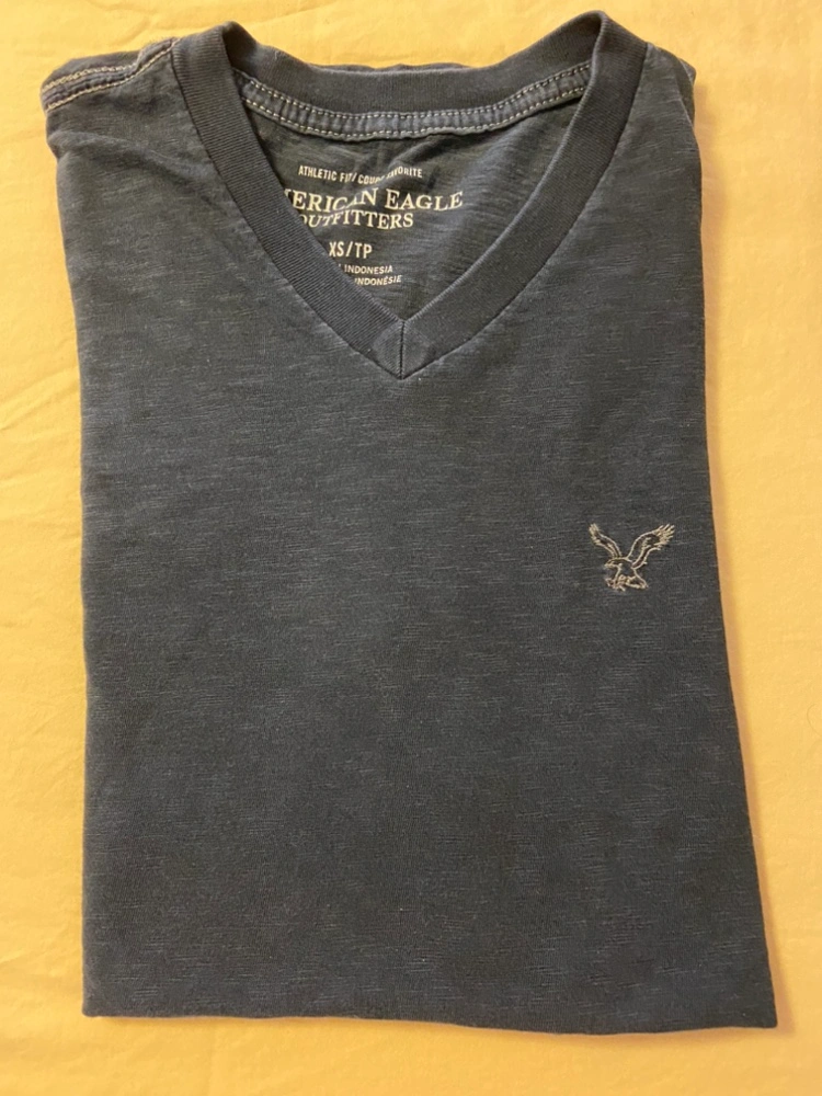 American Eagle Outfitters V-Neck T-Shirts in navy blue and dark grey. Size XS/TP. Have a small embroidered logo on the front. AE round colour T-shirt navy blue with writing. Free sunglasses included!
