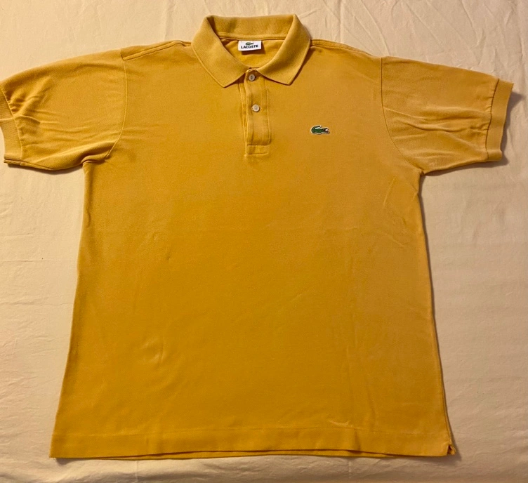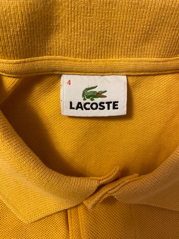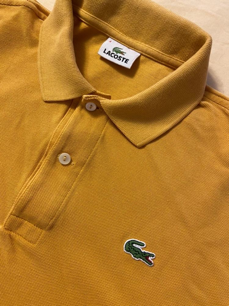 A Lacoste polo shirt in a mustard yellow colour. The shirt is short-sleeved with a two-button placket and a Lacoste crocodile logo on the chest.