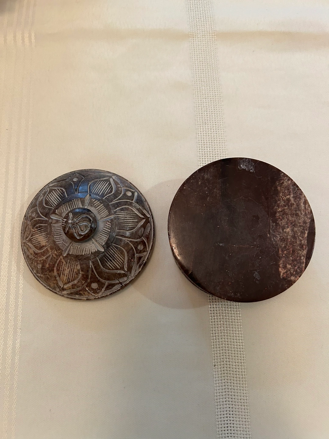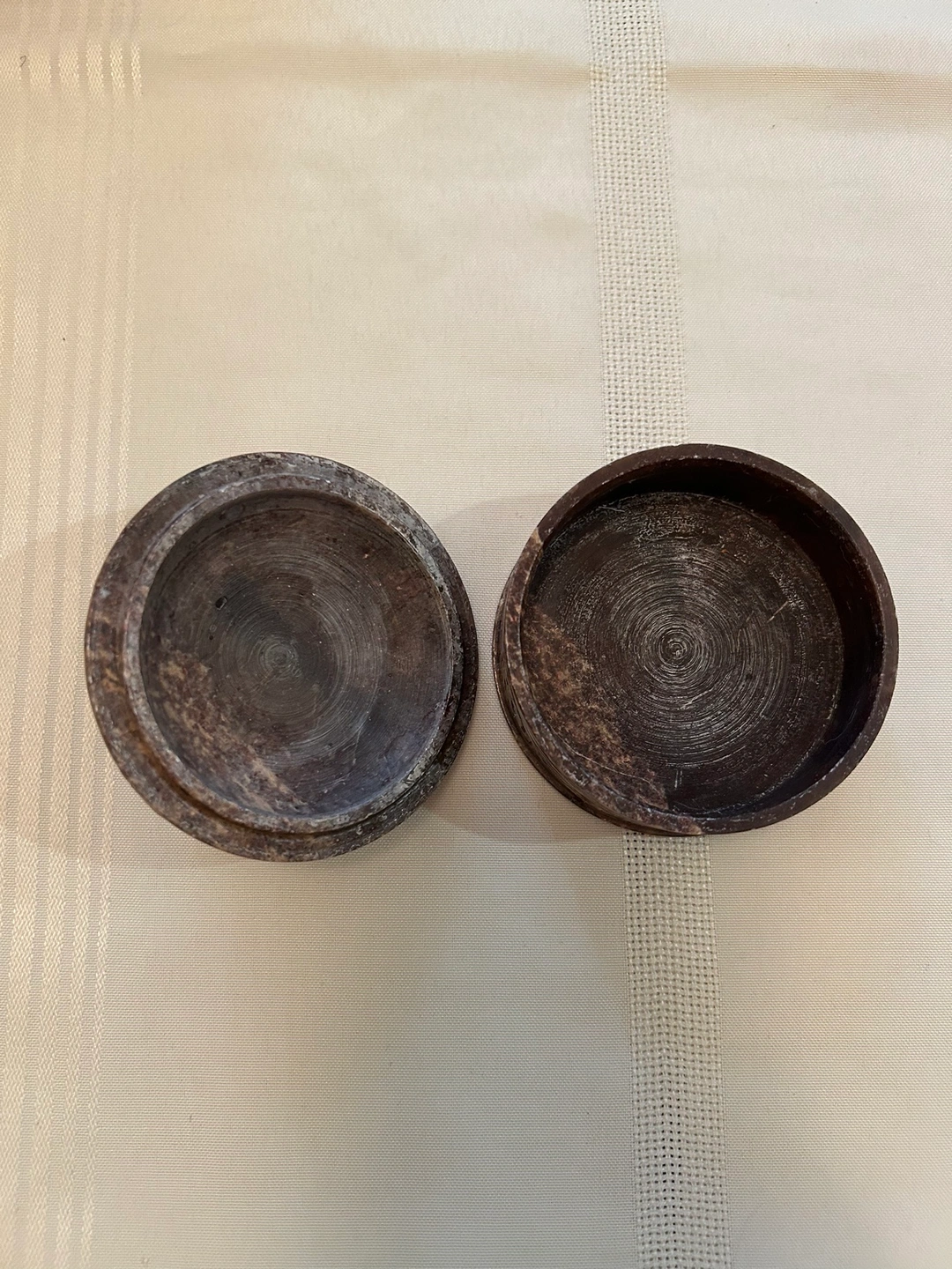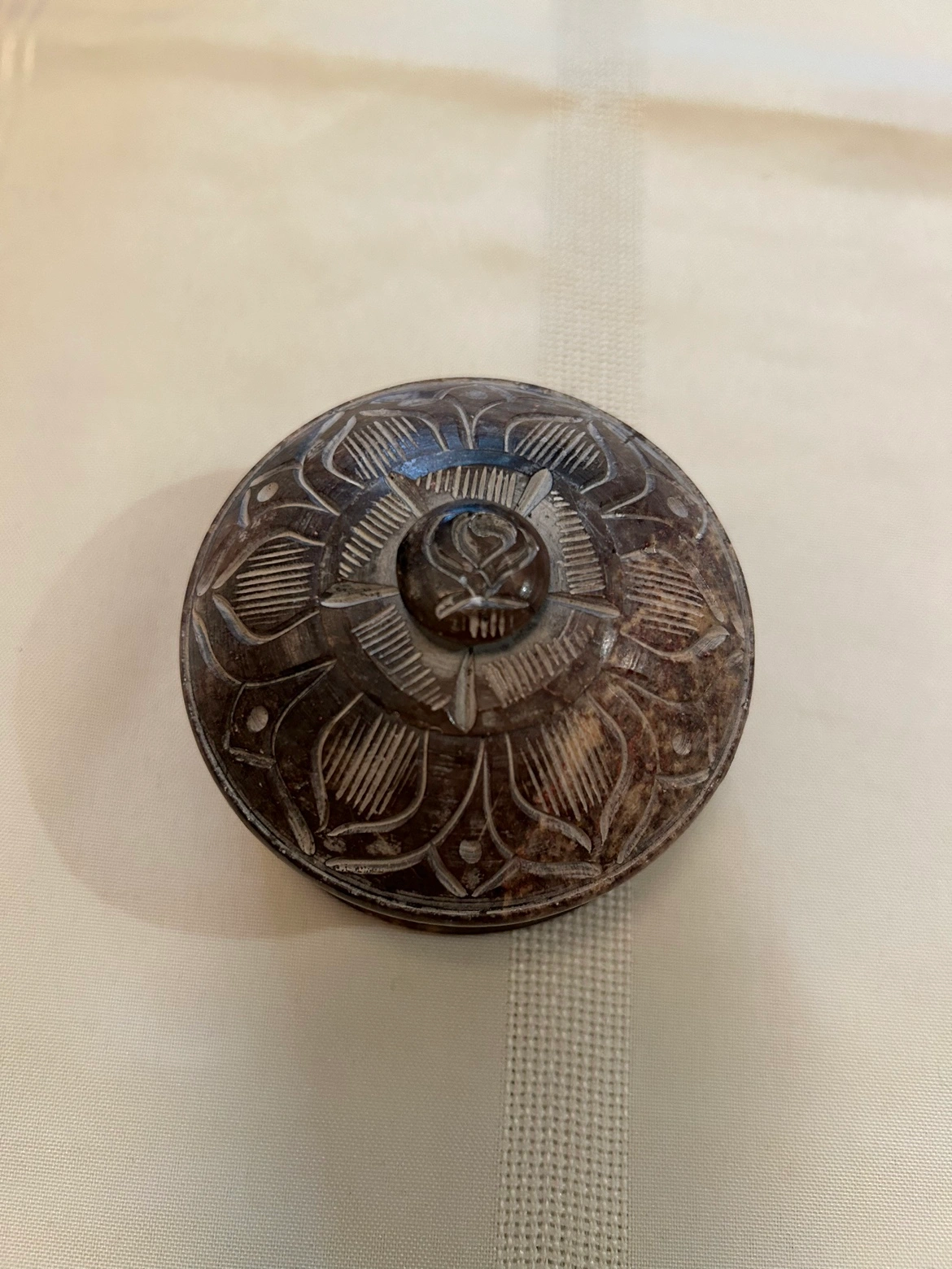 Small round stone trinket box with a carved floral design on the lid. The box is about 3 inches in diameter.