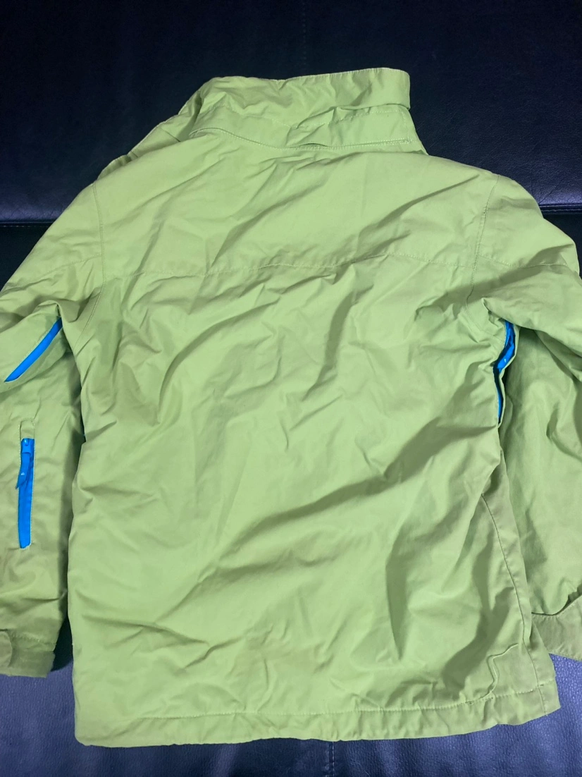 Green and blue ski jacket with zipper closure and multiple pockets.