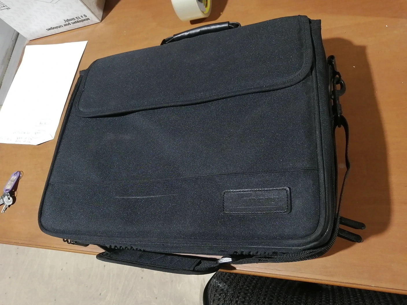 A black laptop bag with a handle and a shoulder strap. It has a zippered closure and a flap with a snap closure. The bag is in good condition with some wear and tear. Call Tony 416-722-7198