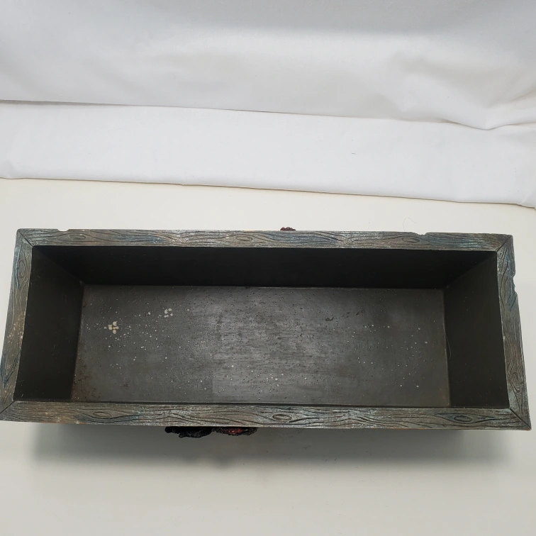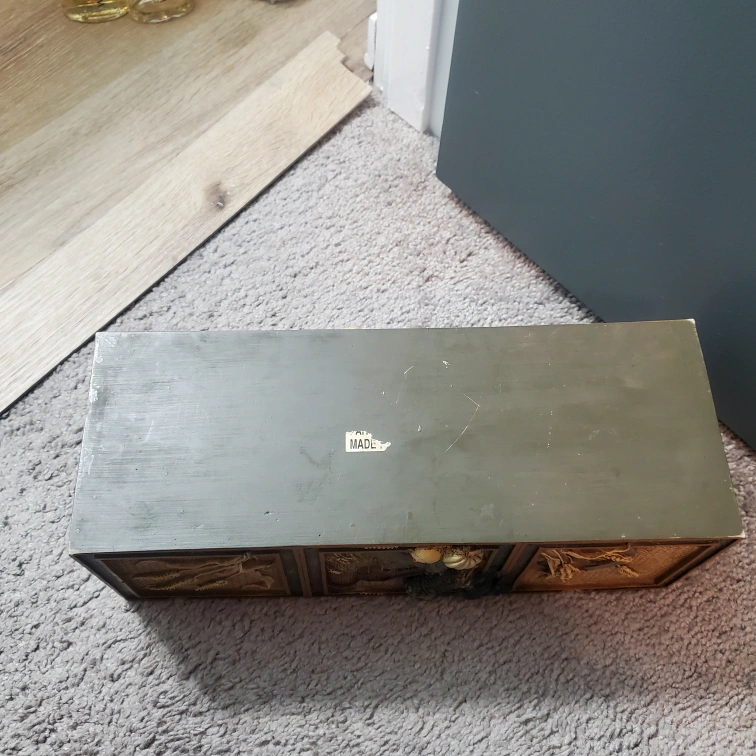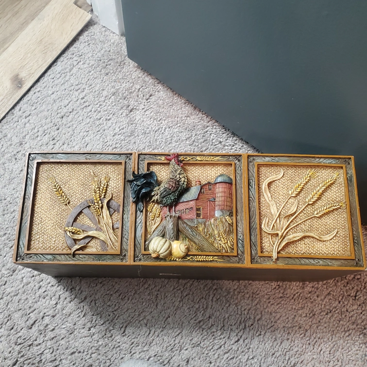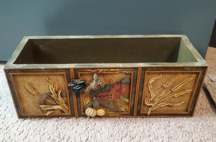 A decorative box with a rooster and farmhouse theme. It has a rustic design and would be perfect for holding small items or displaying on a shelf.Has a decent weight to it. Bottom has wear. There is a few chips on the sides but in over all good condition. The measurements are 13.5" long by 5.25" wide by roughly 4.5" tall. Located northside by londonderry mall.