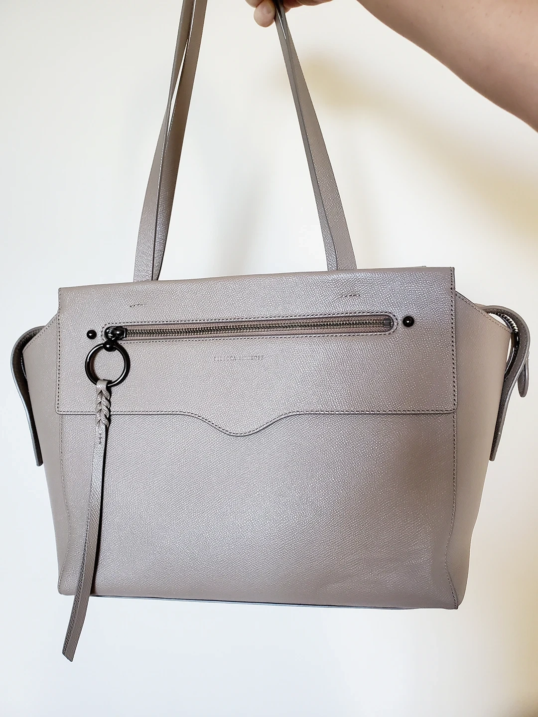 Stylish, lightweight, weather resistant, scratch proof leather tote in beautiful taupe colour from Rebecca Minkoff. Highly functional with lots of room and pockets, cotton fabric interior, smooth zippers, and 100% leather exterior. Fits 13" laptop and wears very comfortably.