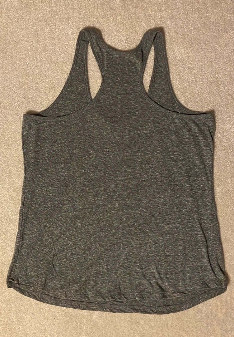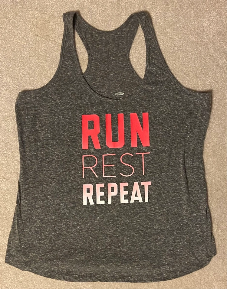 1000+Grey tank top with a pink "Run Rest Repeat" graphic. It is a size XL/TG.
