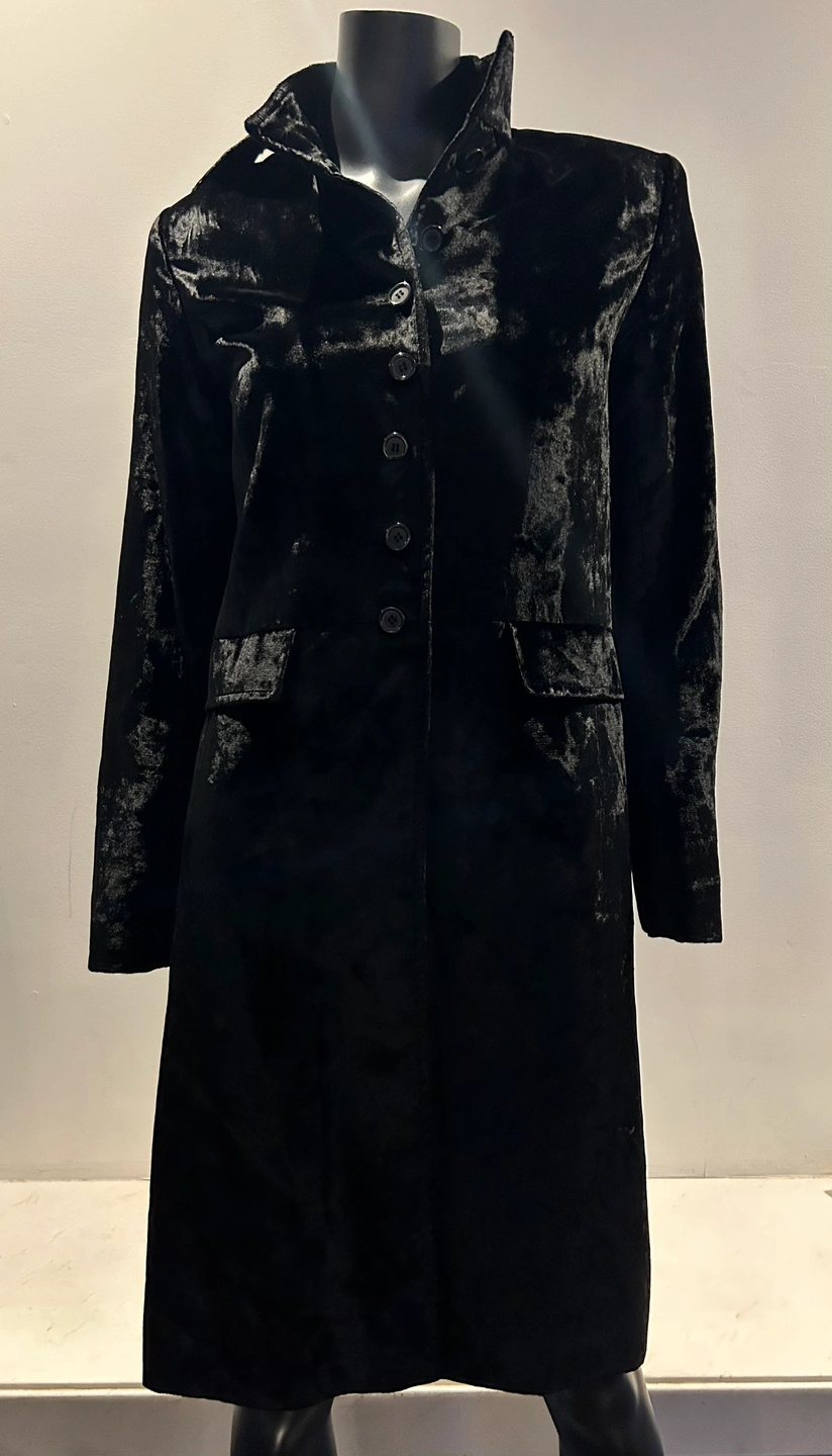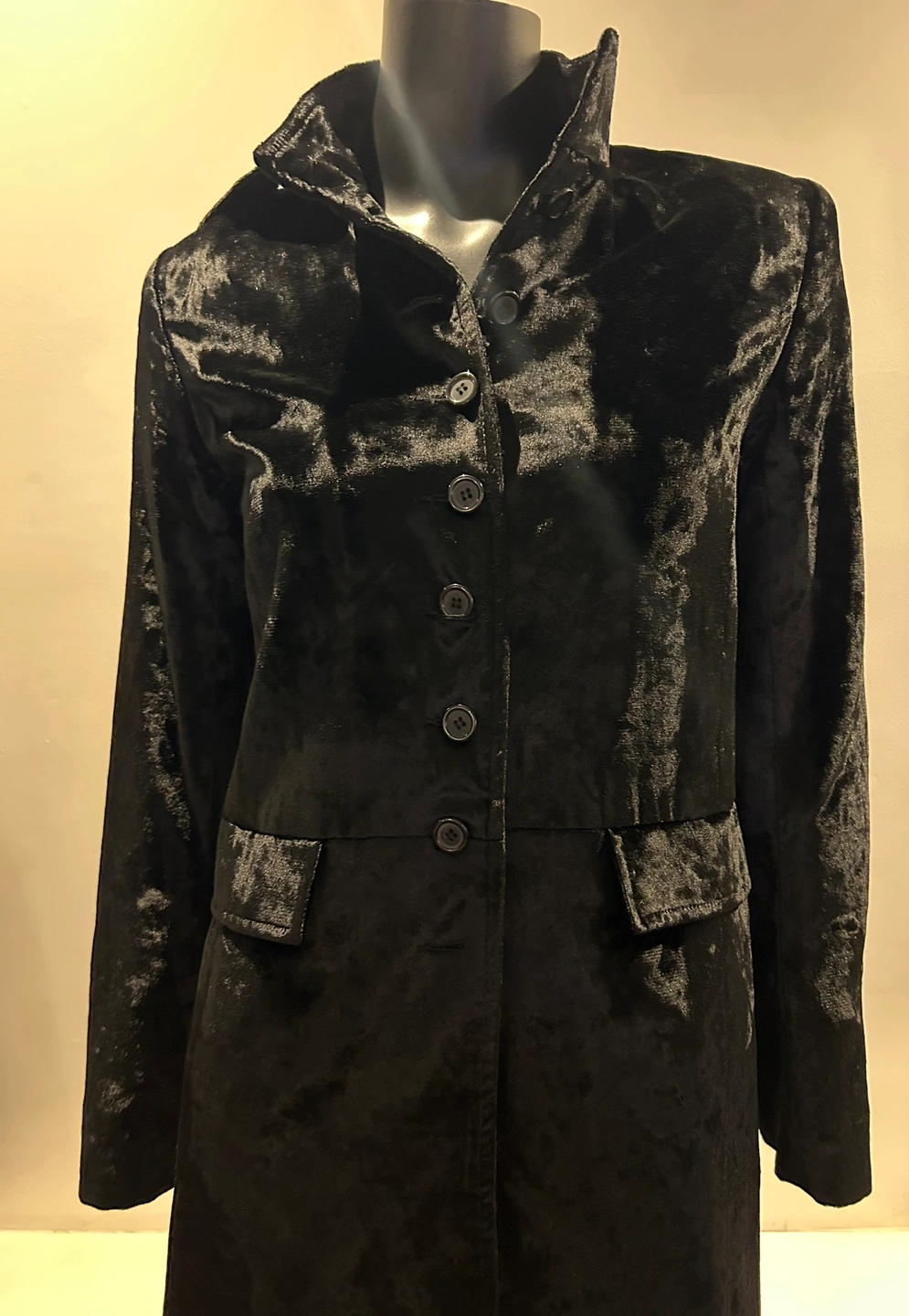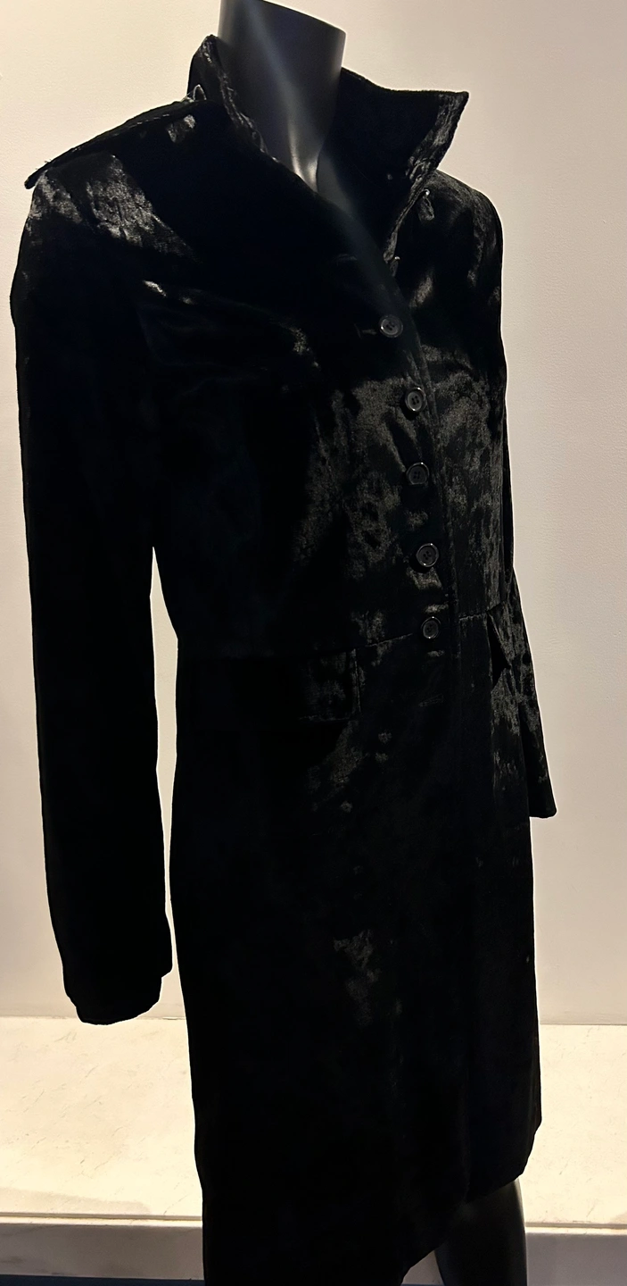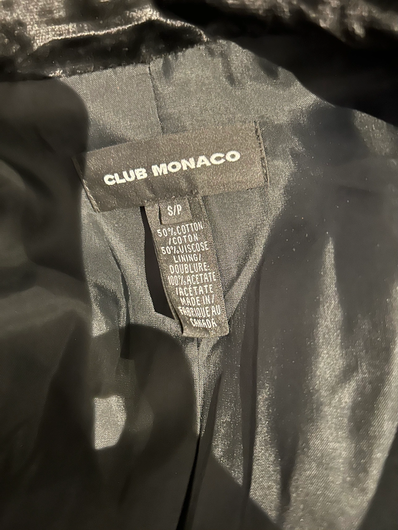 308Beautiful and elegant crushed velvet black coat from Club Monaco. Button closure. Pockets. Collar. Like new. Perfect condition. Size small. Cotton/viscose. Great for dress up Long-sleeved black velvet jacket with a stand-up collar and button closure. The jacket has two front pockets. It is in like new condition.