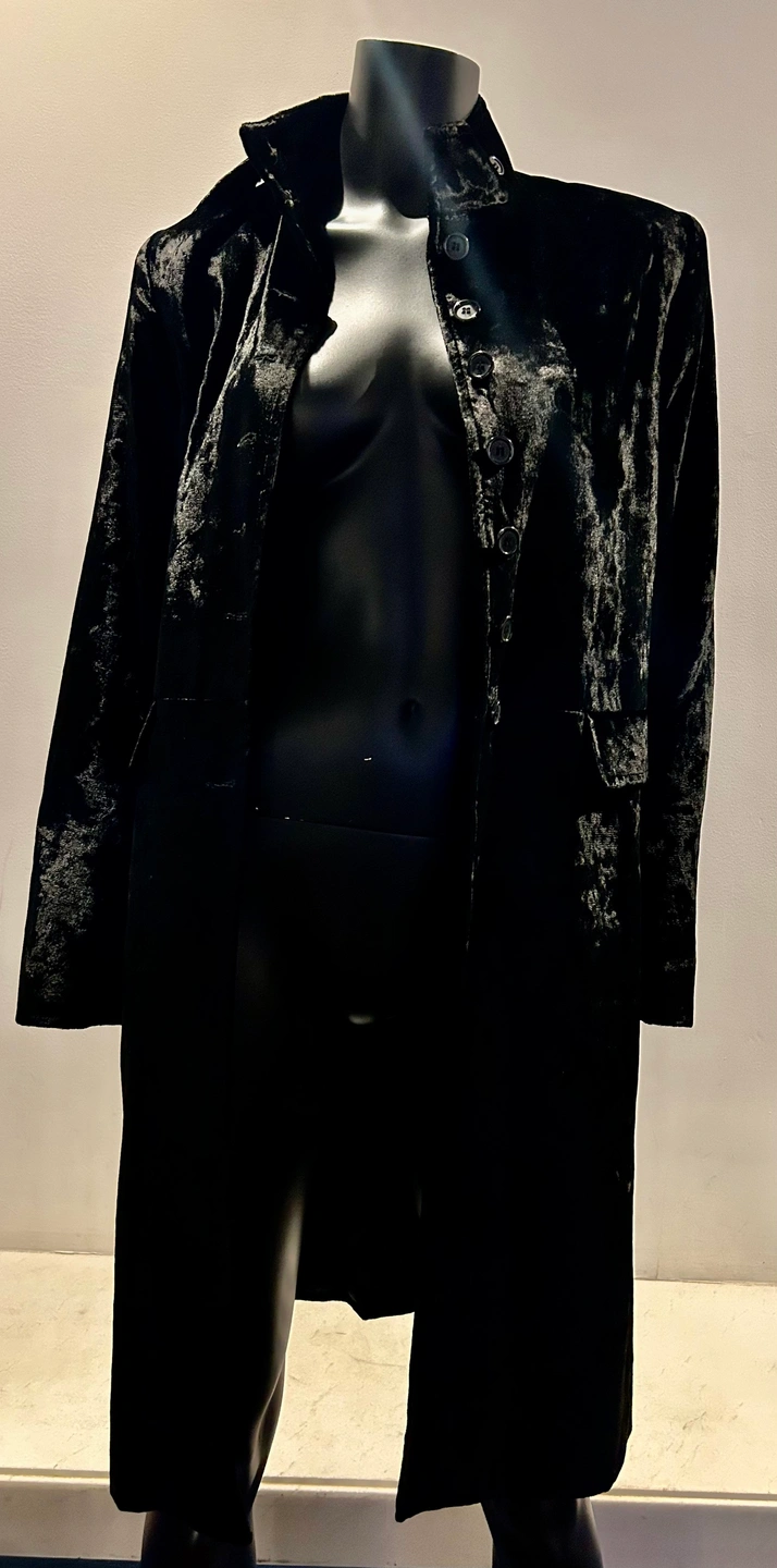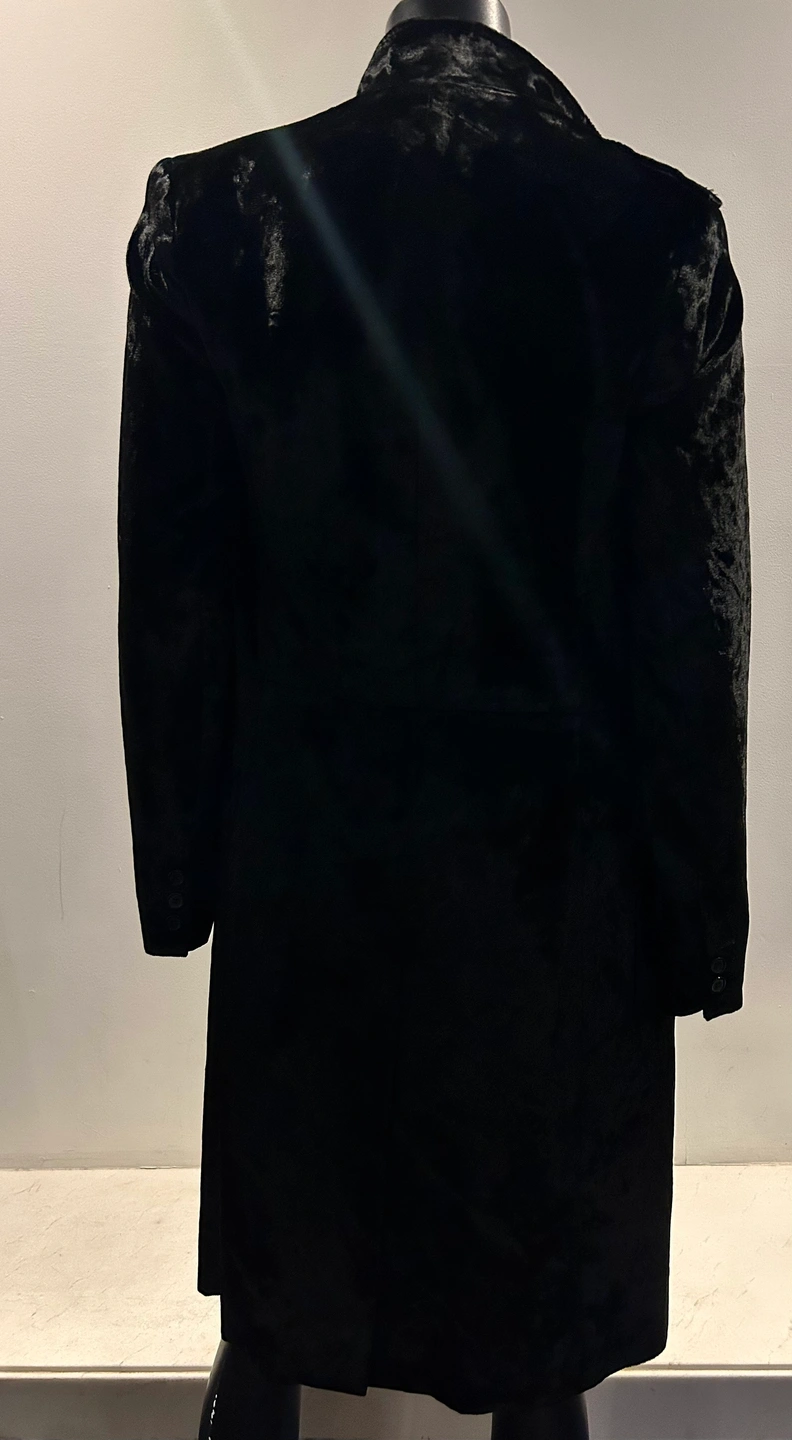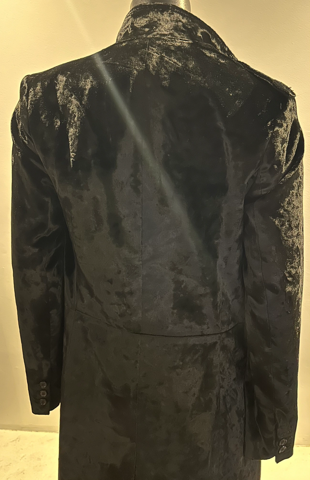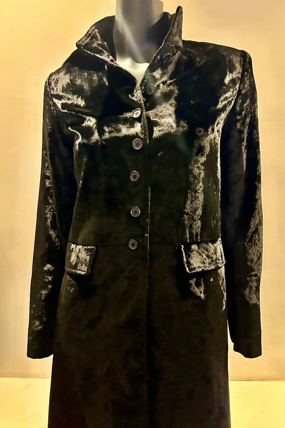 308Beautiful and elegant crushed velvet black coat from Club Monaco. Button closure. Pockets. Collar. Like new. Perfect condition. Size small. Cotton/viscose. Great for dress up Long-sleeved black velvet jacket with a stand-up collar and button closure. The jacket has two front pockets. It is in like new condition.