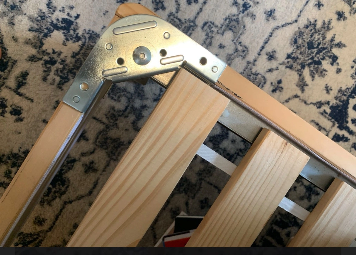 A wooden bed frame with slabs in good condition. Including the legs (not original), disassembled