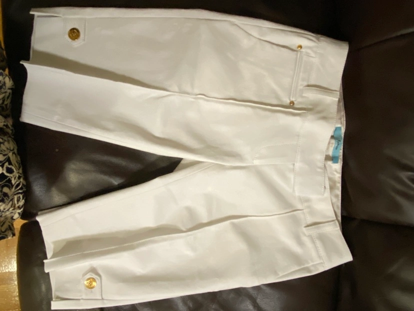 White capris with gold buttons and pockets. Size 2. Made in China. Fabric is 47% modal, 47% Lyocell, 5% spandex, 1% polyester, and 100% polyester lining.