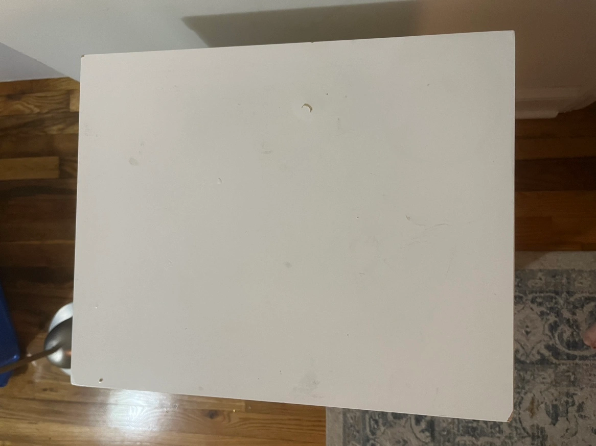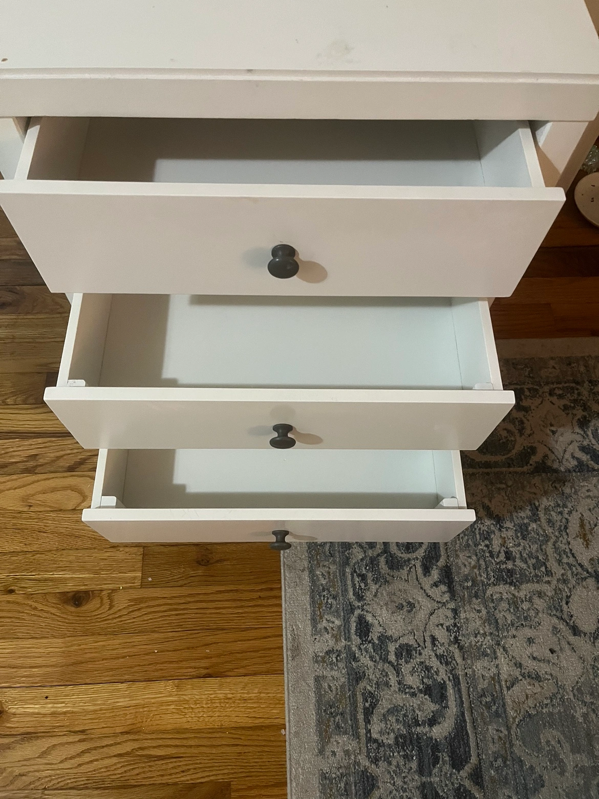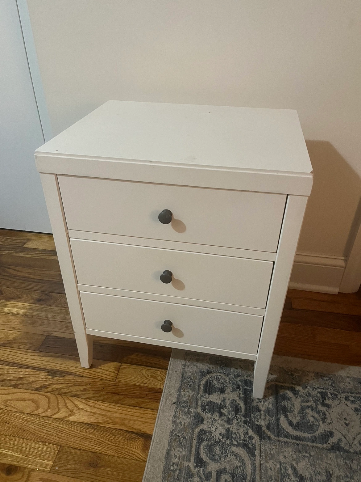 White nightstand with three drawers. The top has a few marks and scratches, but otherwise it’s in good shape. Pick up outside the apartment.