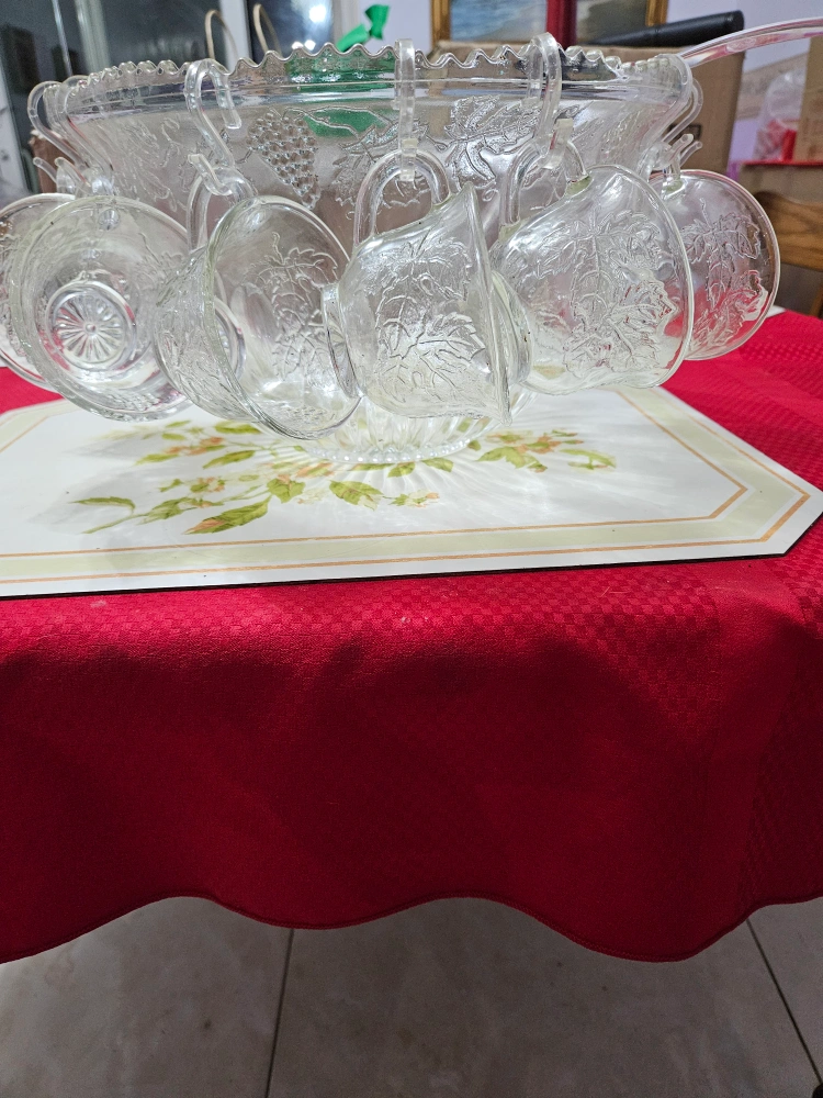 This vintage punch bowl set features a large bowl and 8 matching cups. The set is decorated with a grape and vine design. The punch bowl is in excellent condition. The cups are in good condition. Available for pick up in Bath Beach Brooklyn
