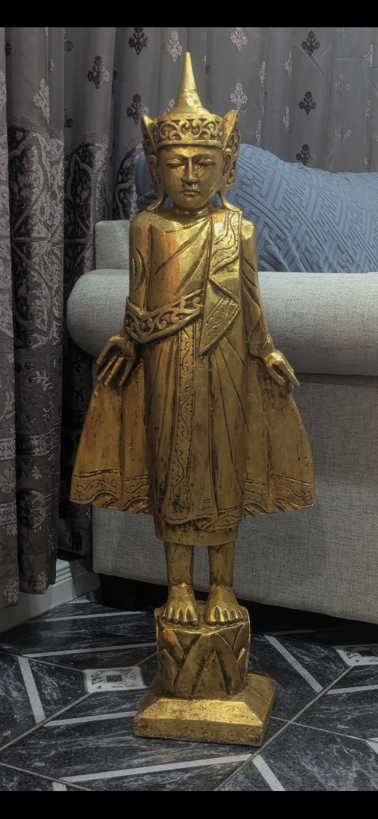 A stunning, ornate Buddha statue crafted from wood and finished with a rich golden hue. Standing 39 inches tall, the statue is in excellent condition, showcasing intricate details and artistry.