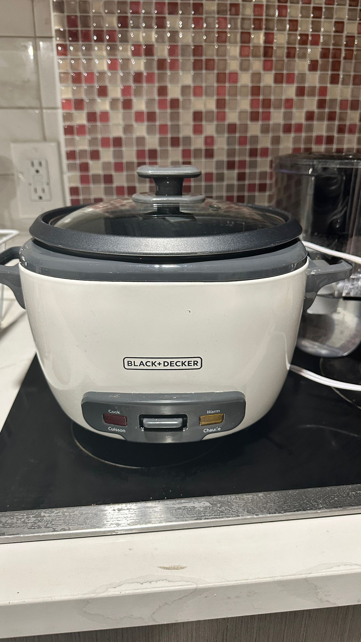 Black + Decker rice cooker with a glass lid. It has a "cook" and "warm" setting. It also has a handle on the side and a handle on the top of the lid.
