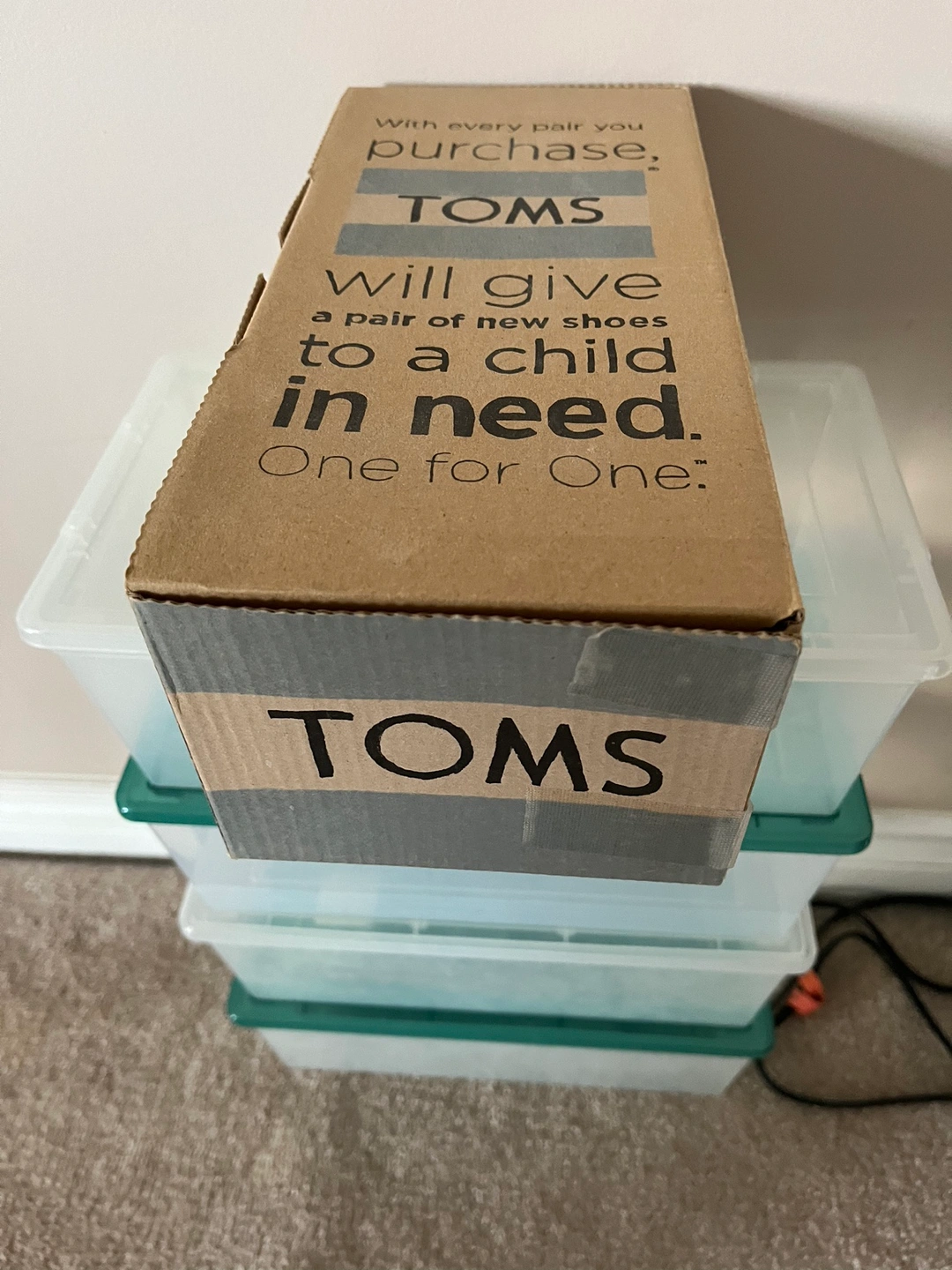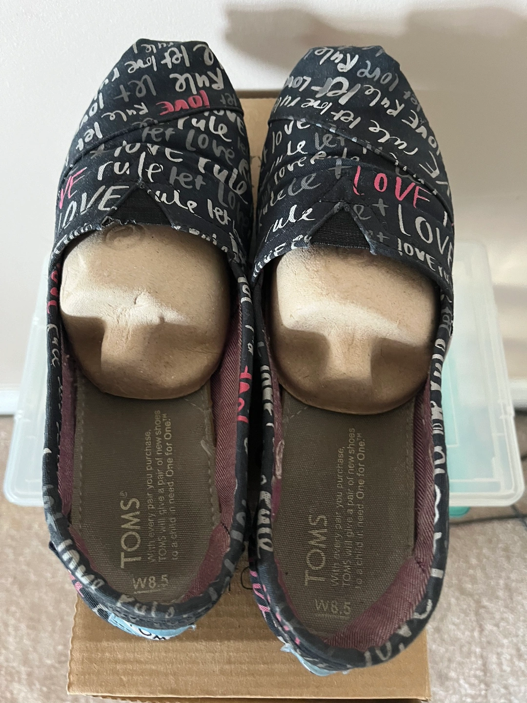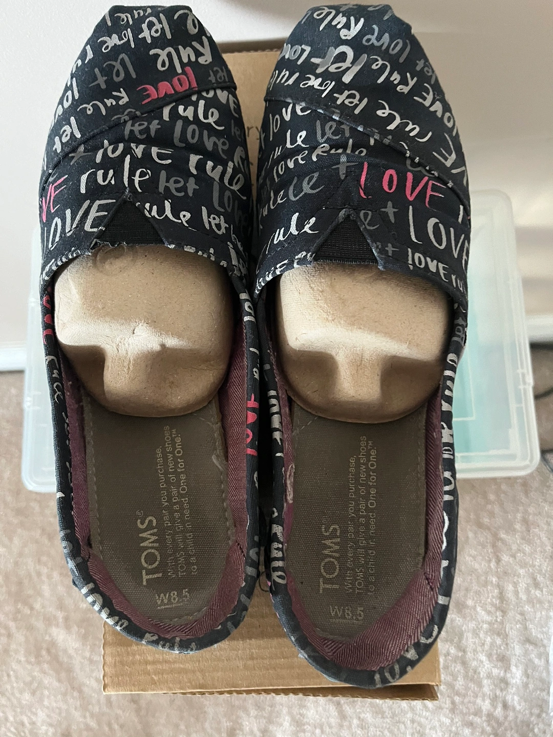 These are a pair of women's TOMS shoes. They feature a black canvas upper with a "love" themed print.