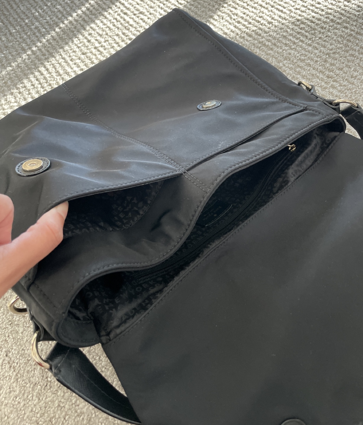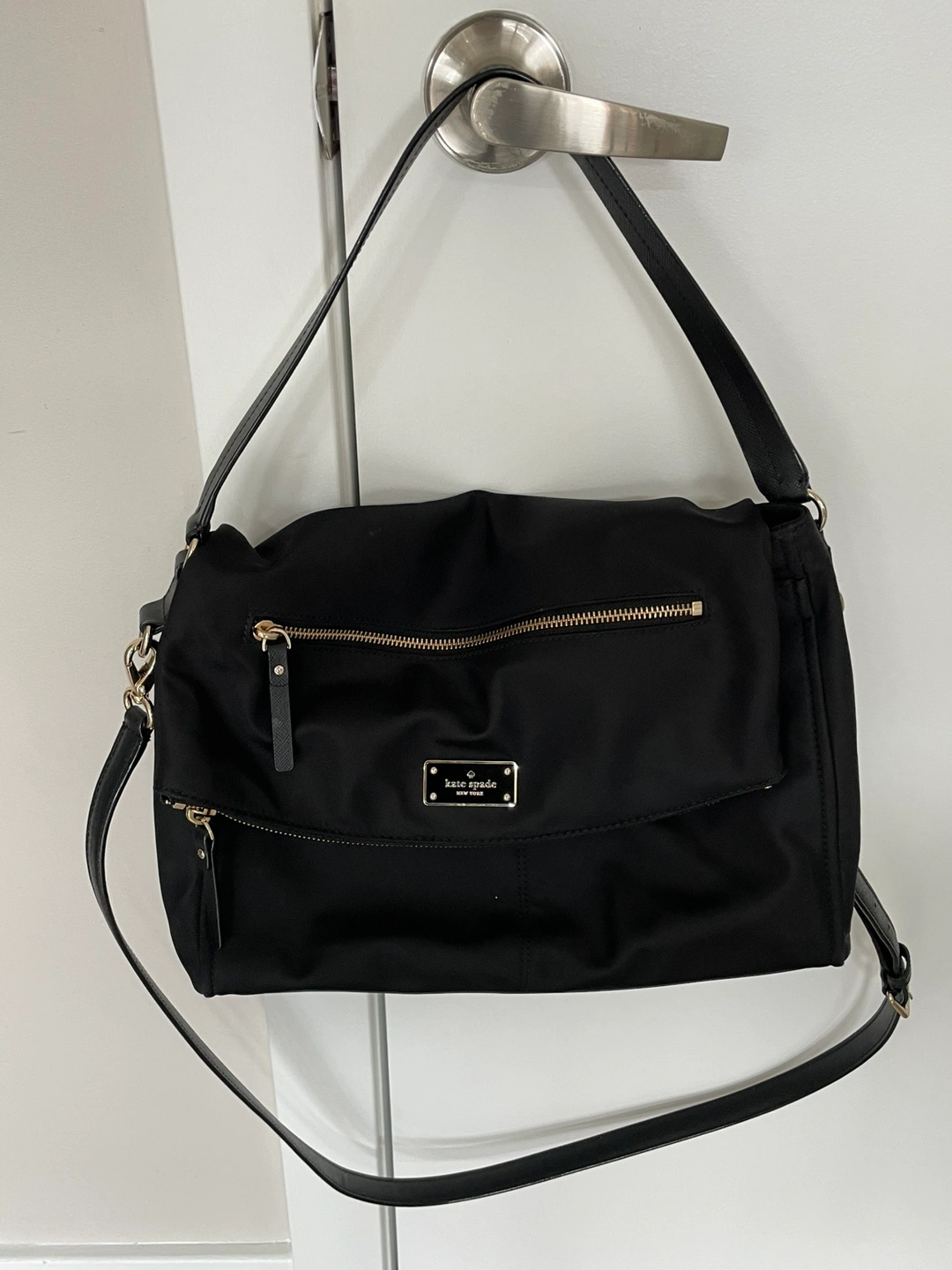 Like New! Black Kate Spade purse with an adjustable strap and removable long strap. The bag is made of a nylon material. It has a zipper closure and several compartments on the inside. It has a large pocket along the back and three small pockets in the front as well as a zippered pocket inside. The bag features a gold Kate Spade logo on the front.