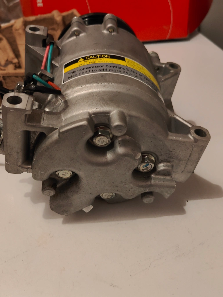 AC compressor with clutch, it seems to have 6 grooves for the pullies. 4.5 inch pulley diameter.