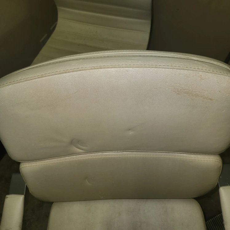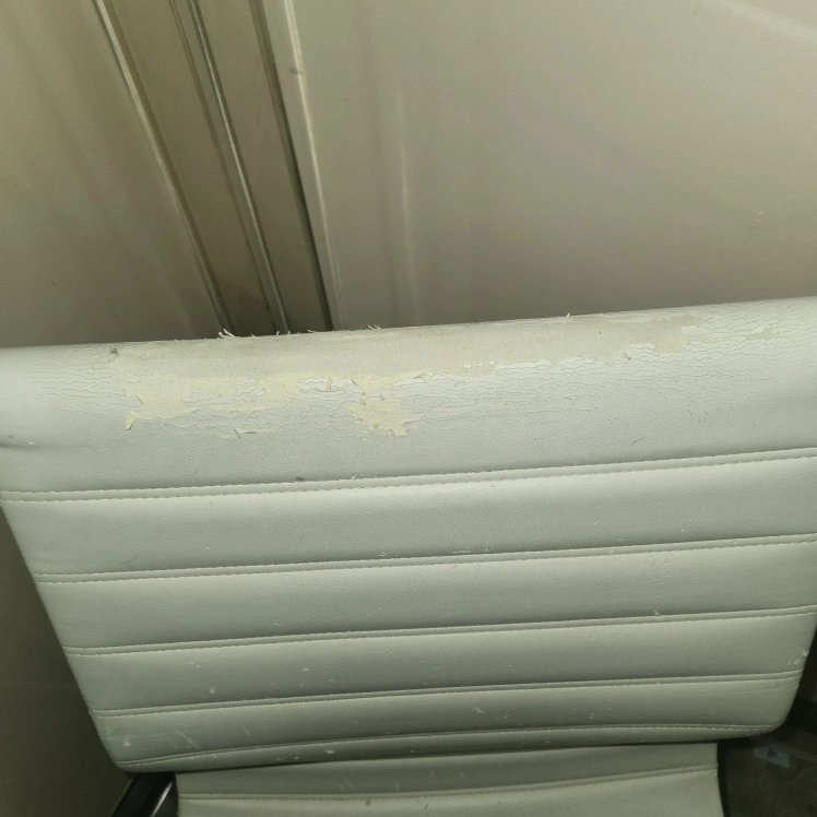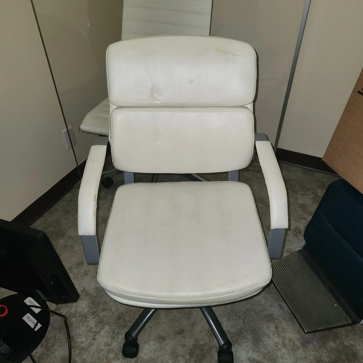 White office chair with adjustable height and swivel base. The chair has some wear and tear. The chair is in used condition. Please see photos. should be upholstered as material is gritty and can come off.