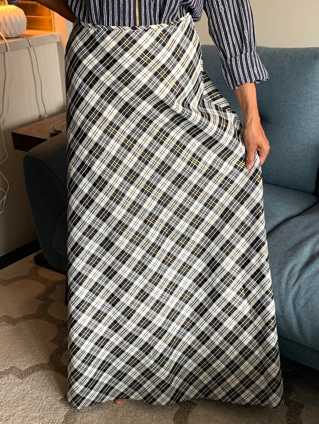 A vintage, long black, white, and metallic gold plaid skirt.