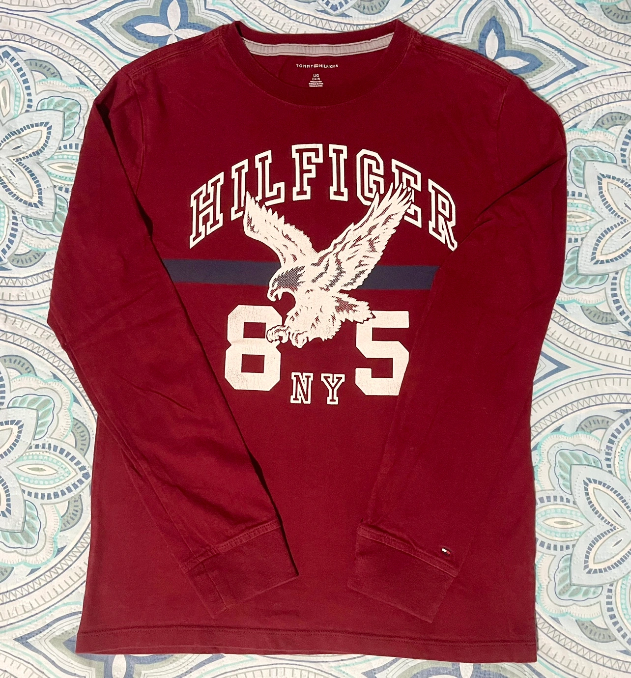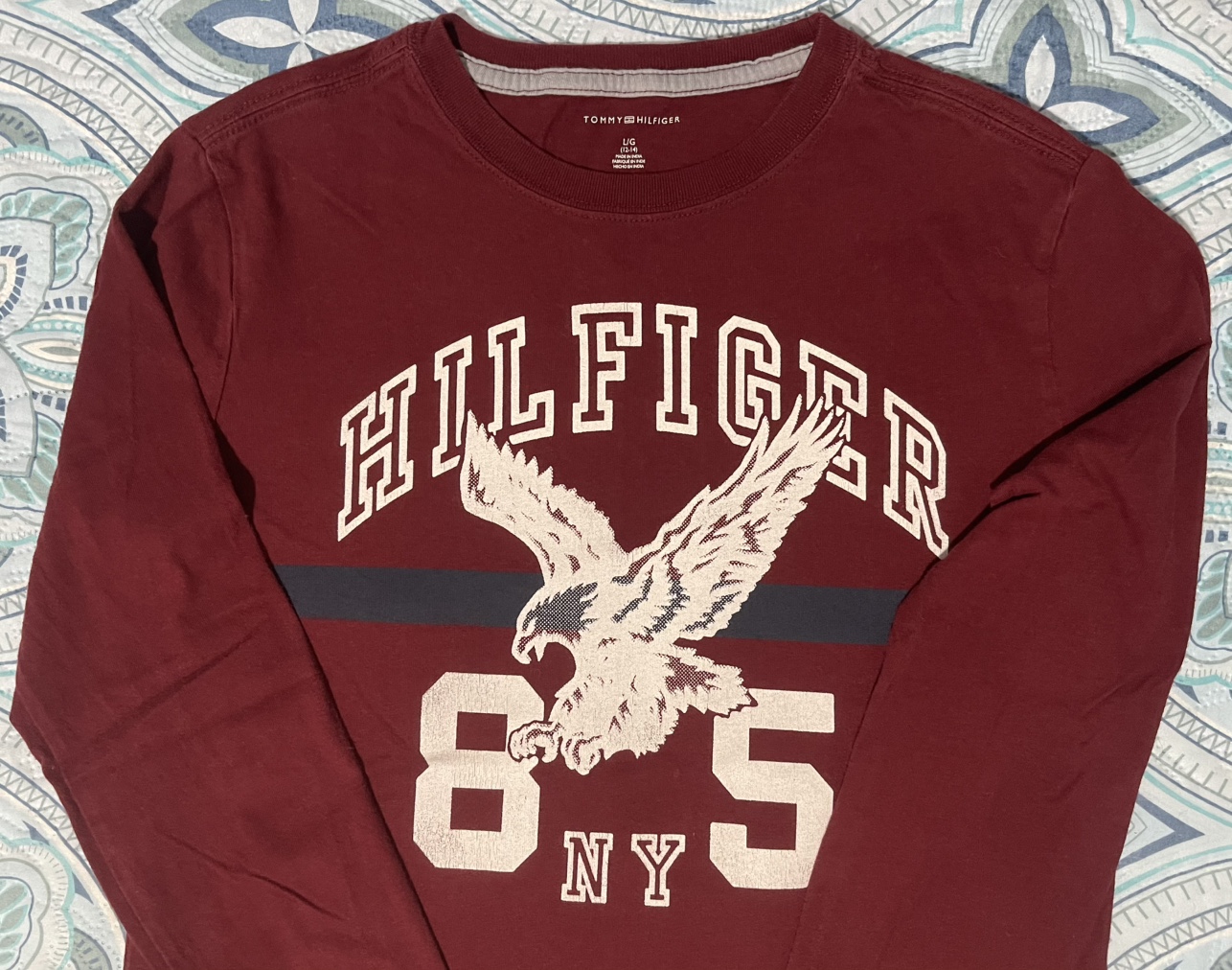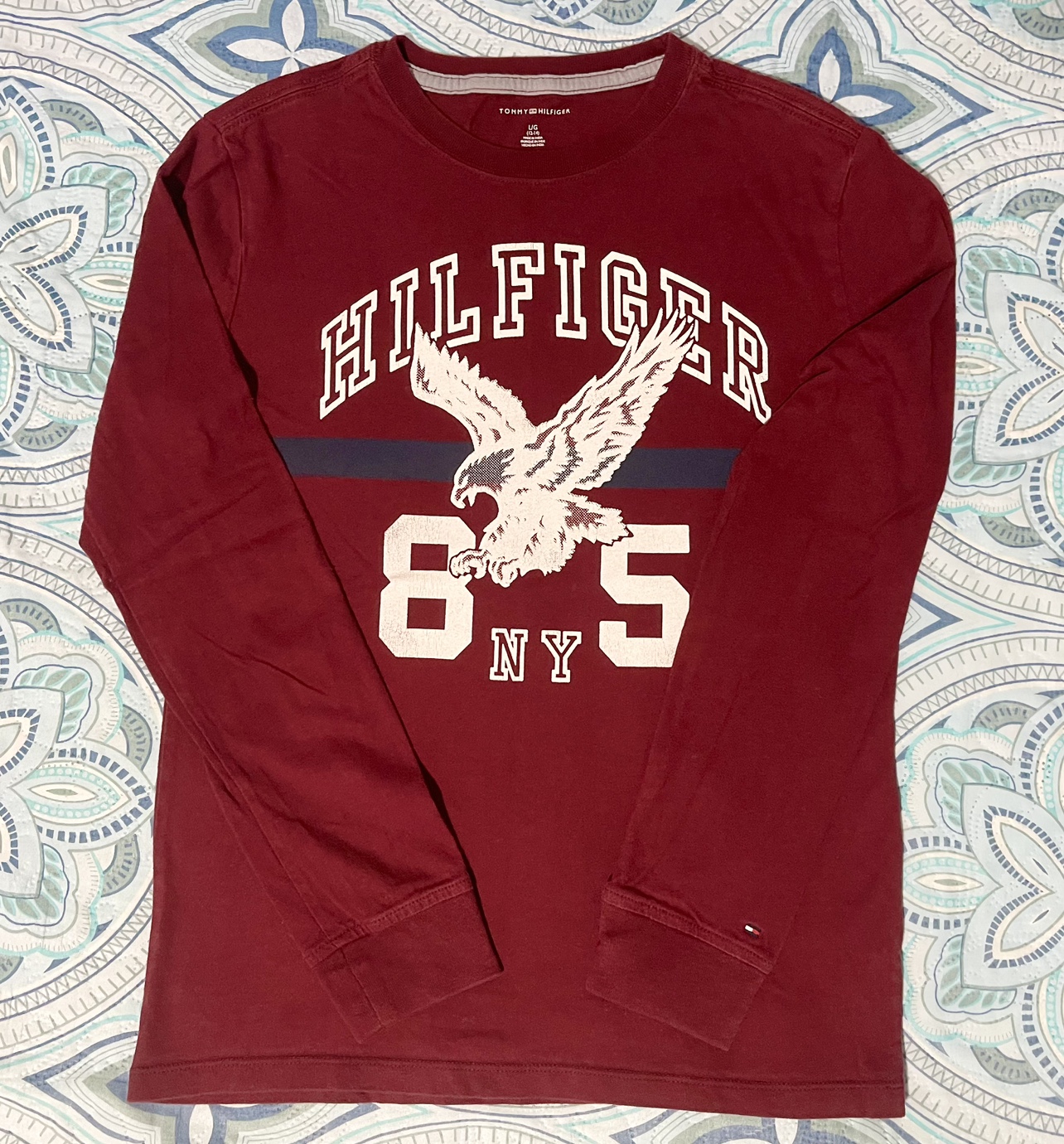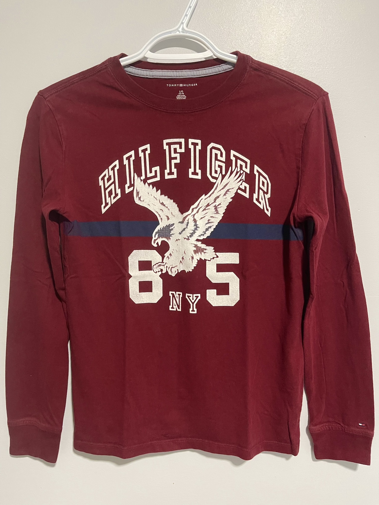 Featuring a graphic print on the front (Hilfiger 85 Eagle NY) and embroidered logo on the left armband.