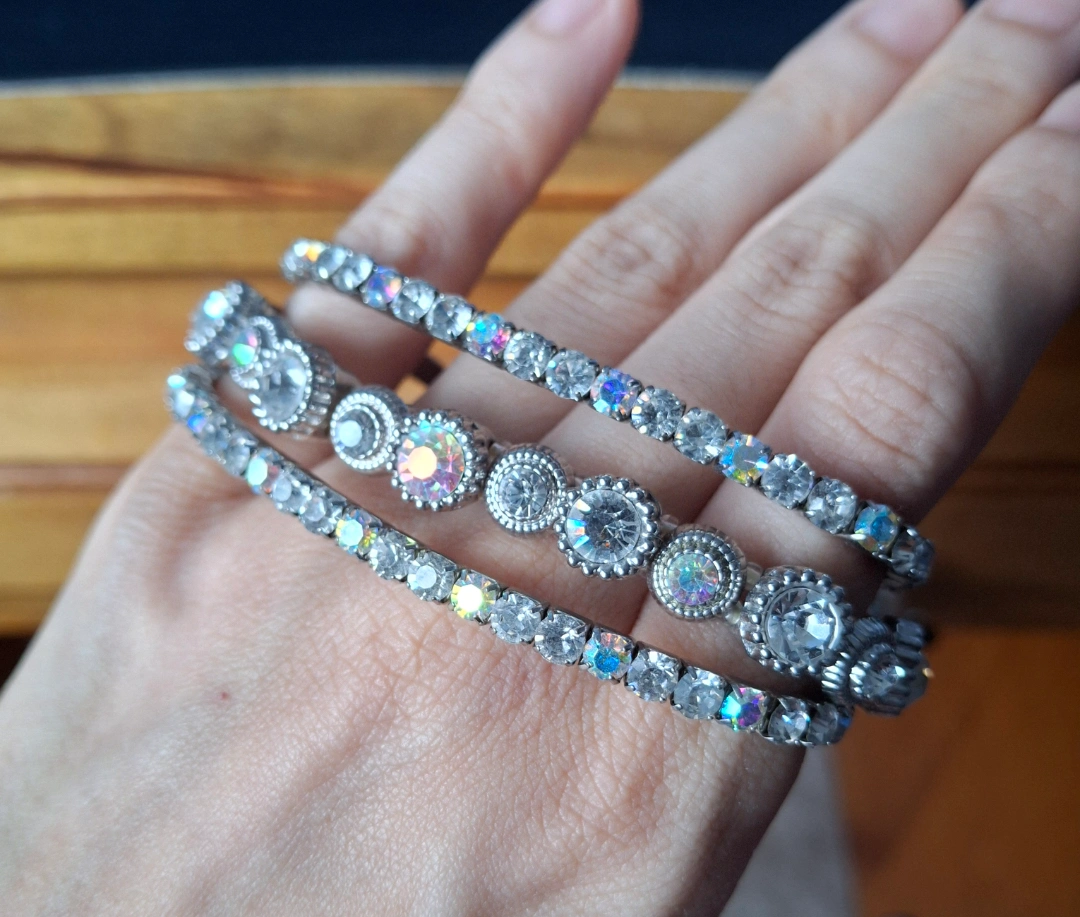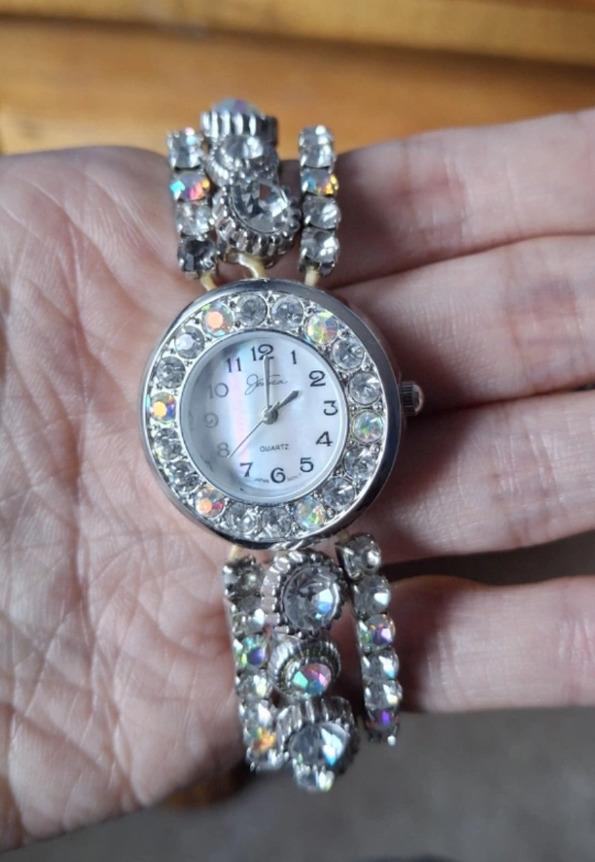 A silver toned watch with a rhinestone crystal face and (elastic) band. Needs a new battery to run, but it's pretty on its own as a bracelet.
