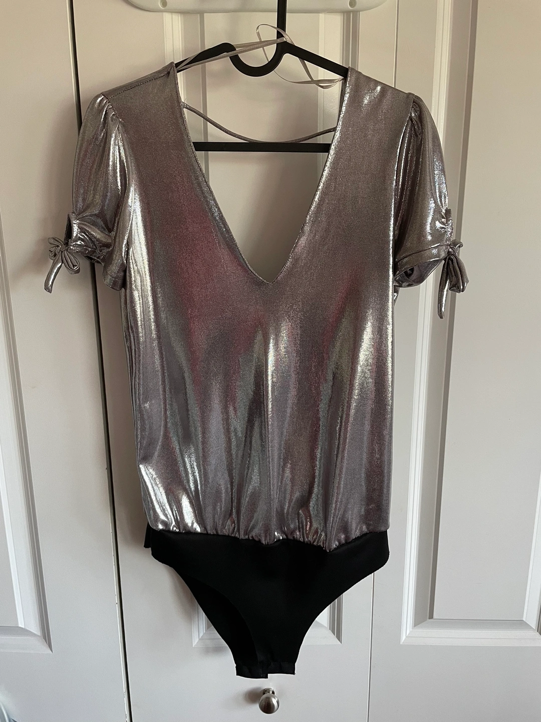 Metallic special edition silver bodysuit with short sleeves and a V-neck. The back has a criss-cross strap detail.