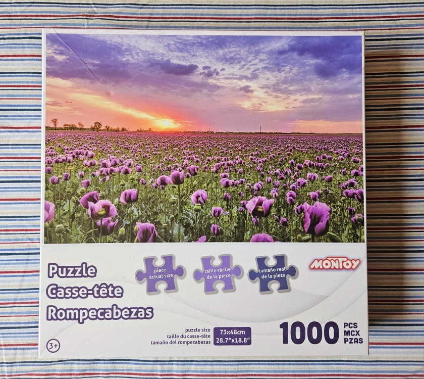 A 1000 piece jigsaw puzzle featuring a sunset over a field of flowers. I've played enough and is still in good shape for someone to use it.