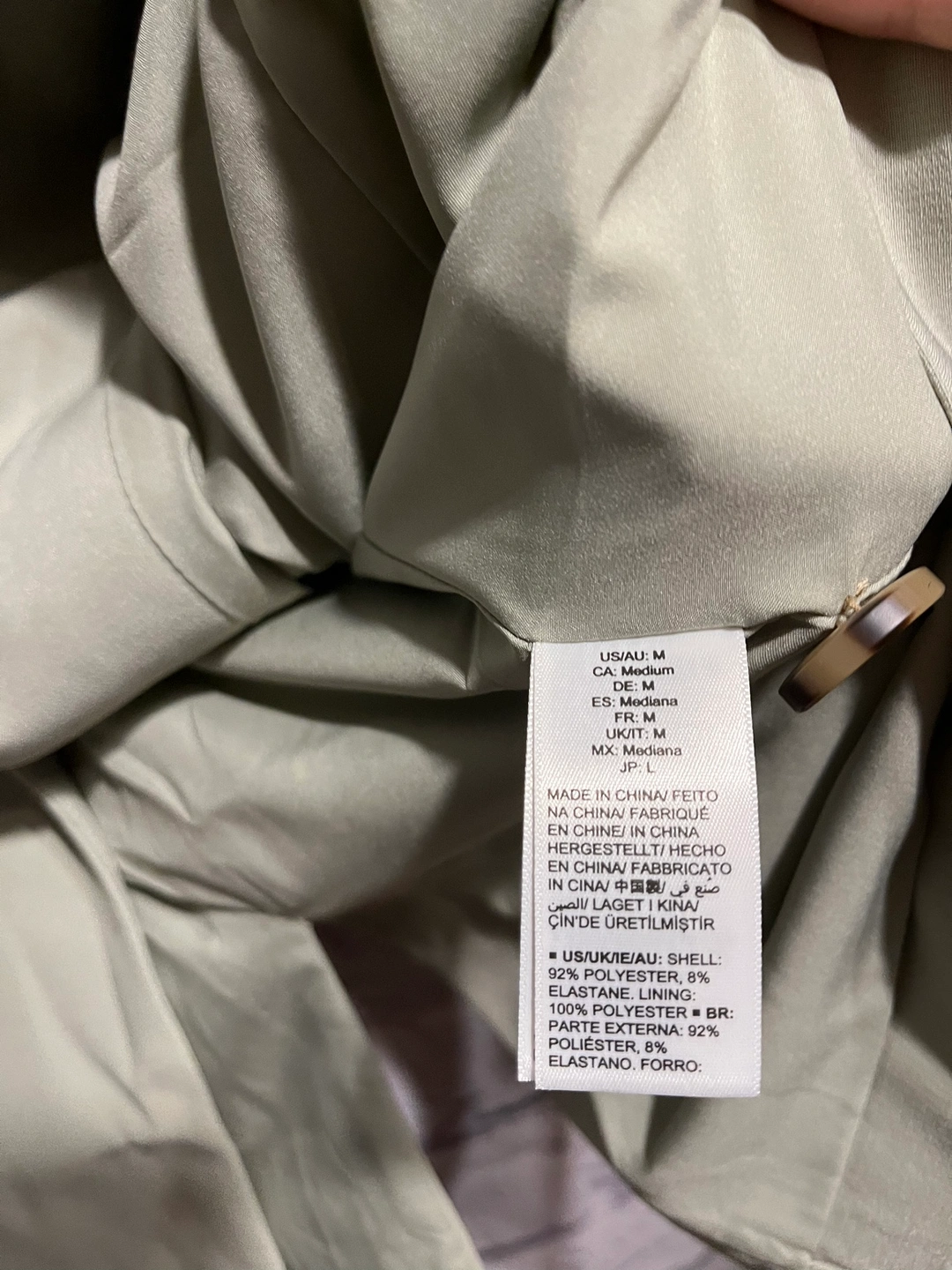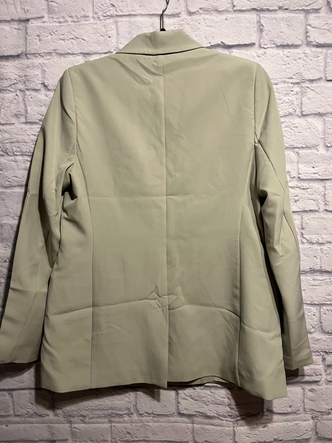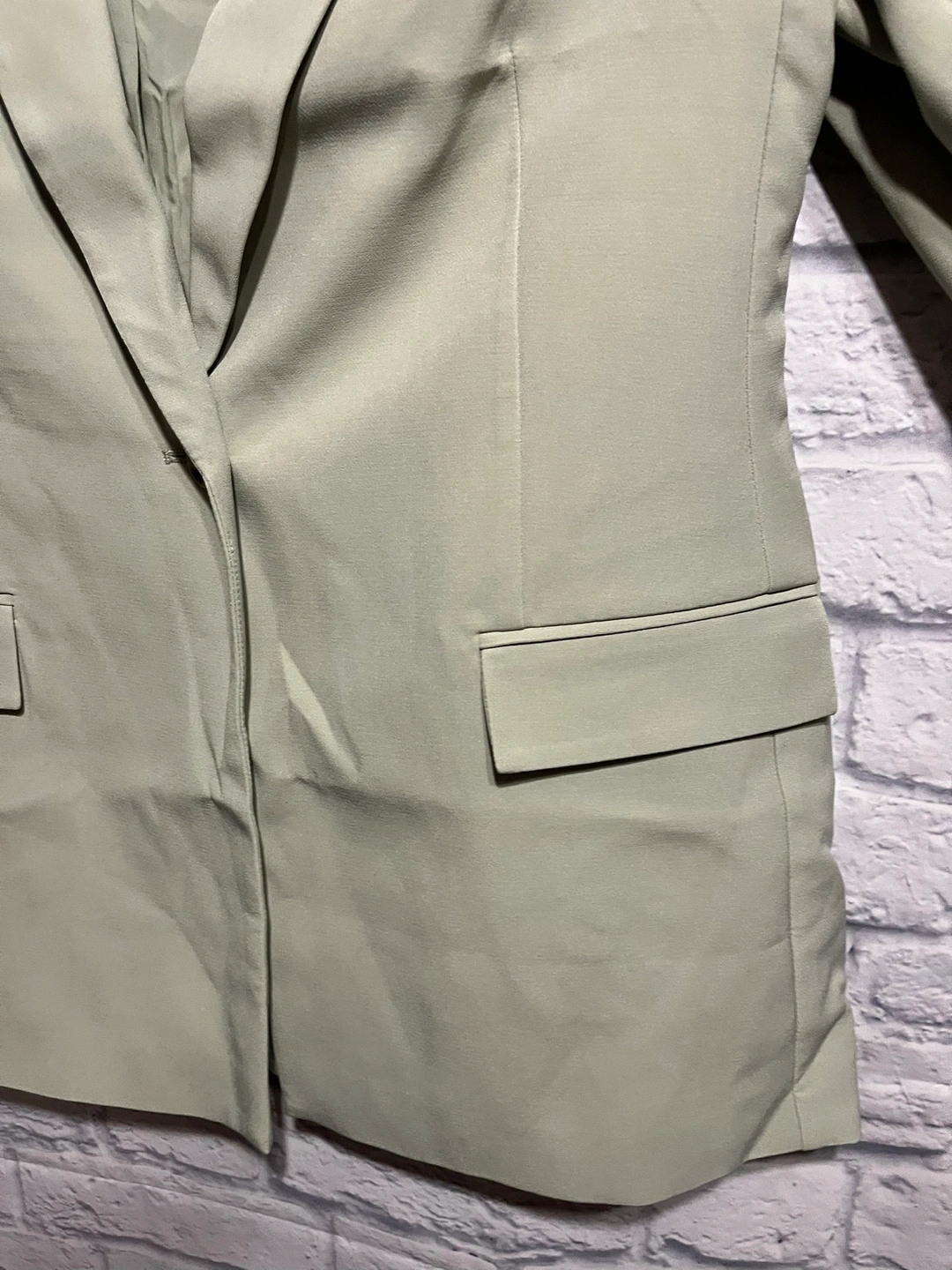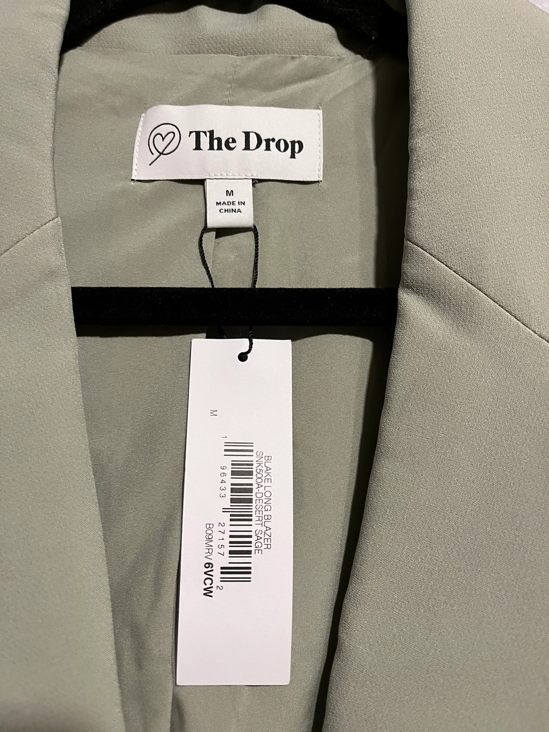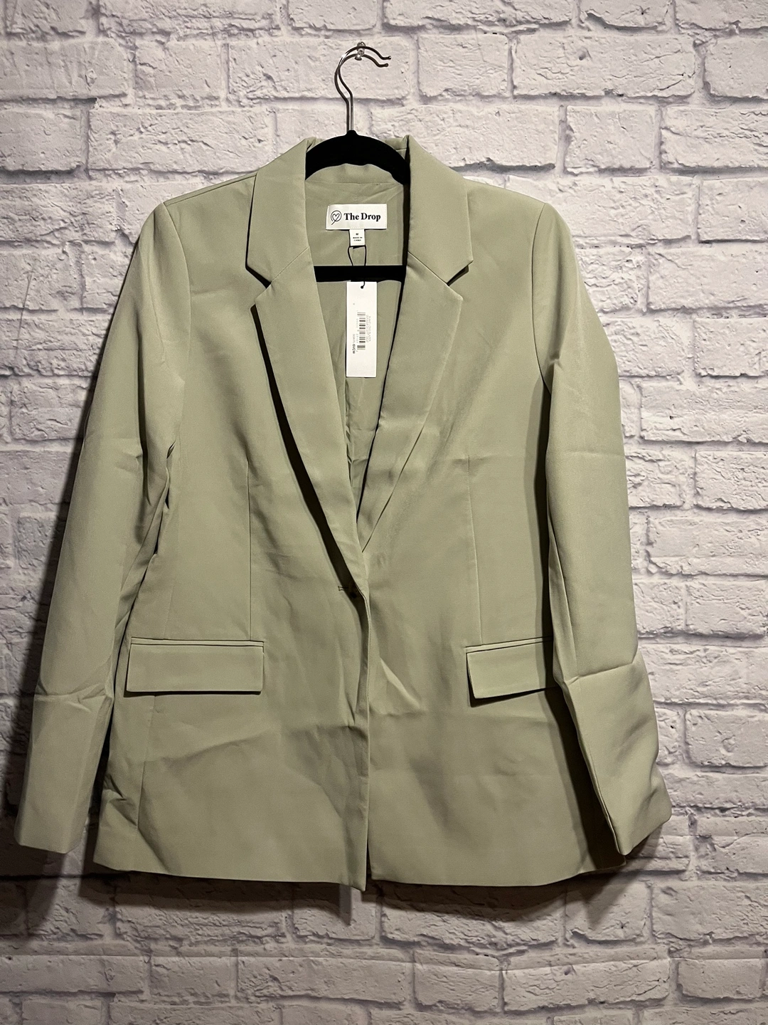 Sage green blazer with long sleeves and a single button closure. The blazer has a pocket on each side. The blazer is made by The Drop and is size Medium. New with tag, retail is $98