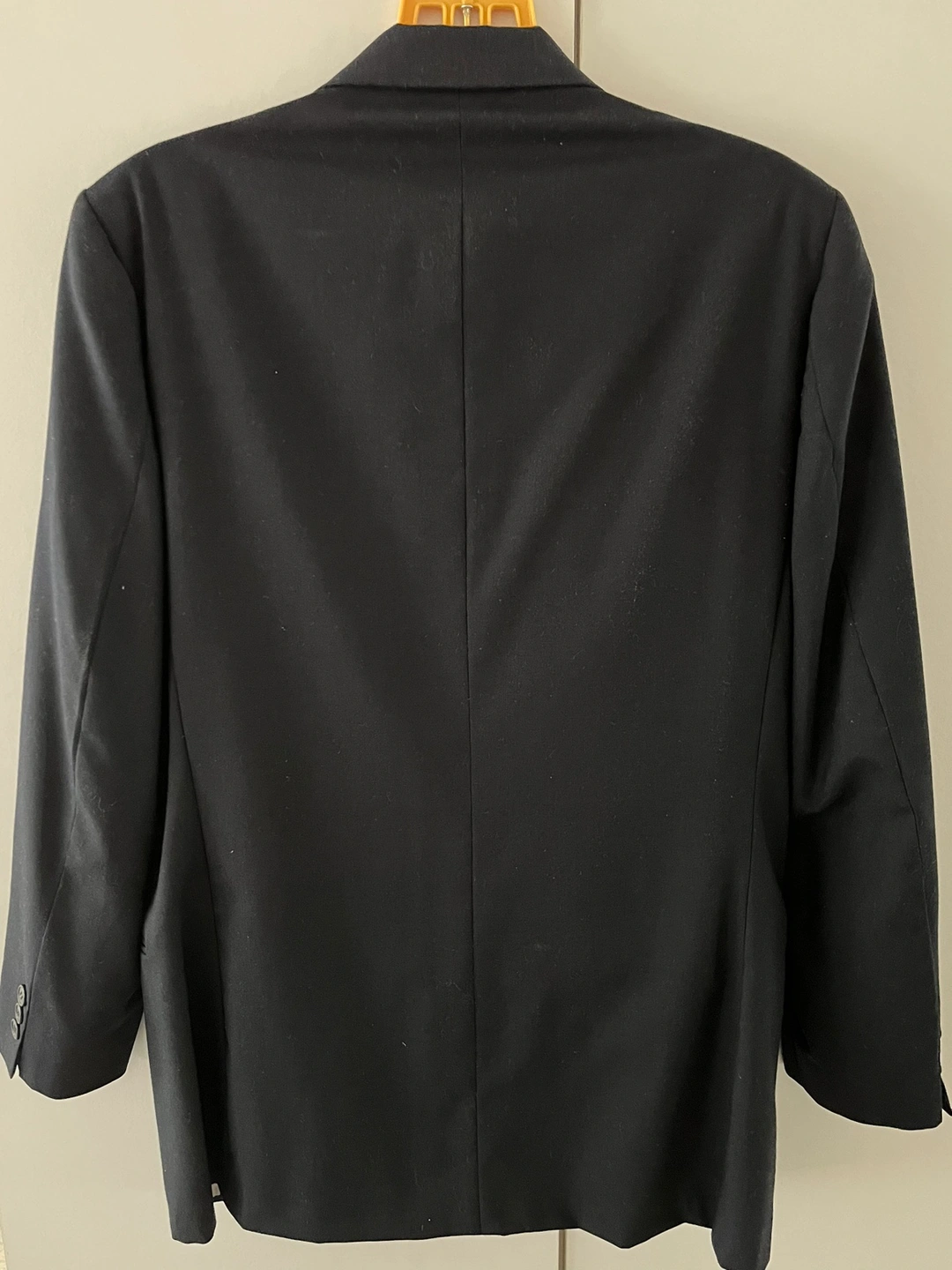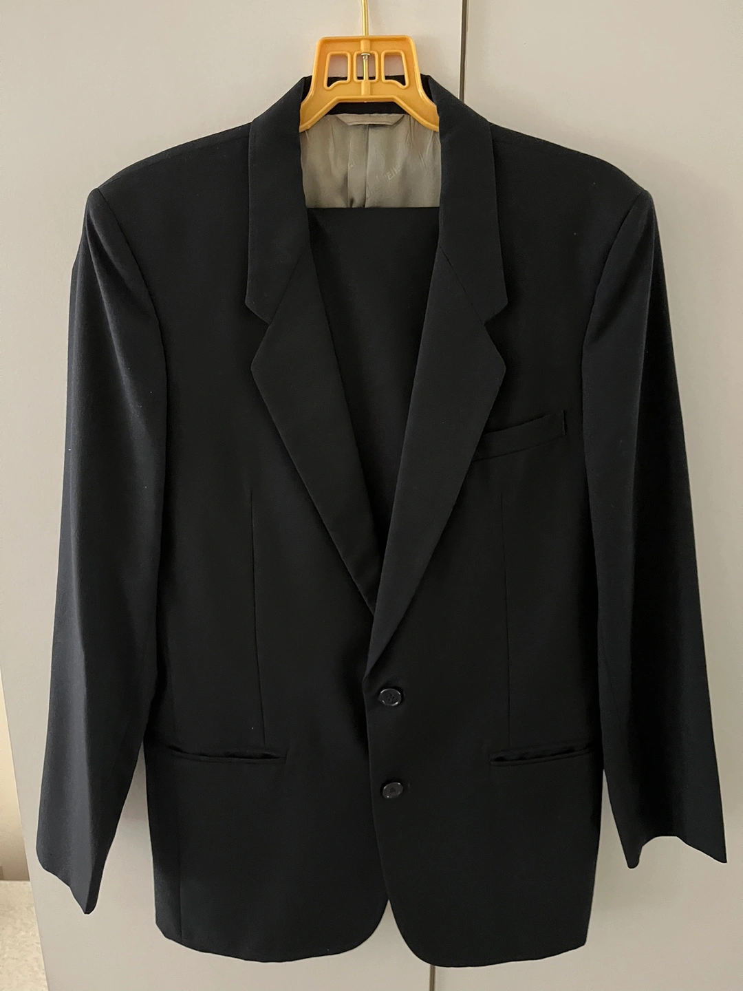 Michel Rene dark blue suit jacket with two button closure. The matching pants are 341/2” waist and 40” long. Other measurements available on request.