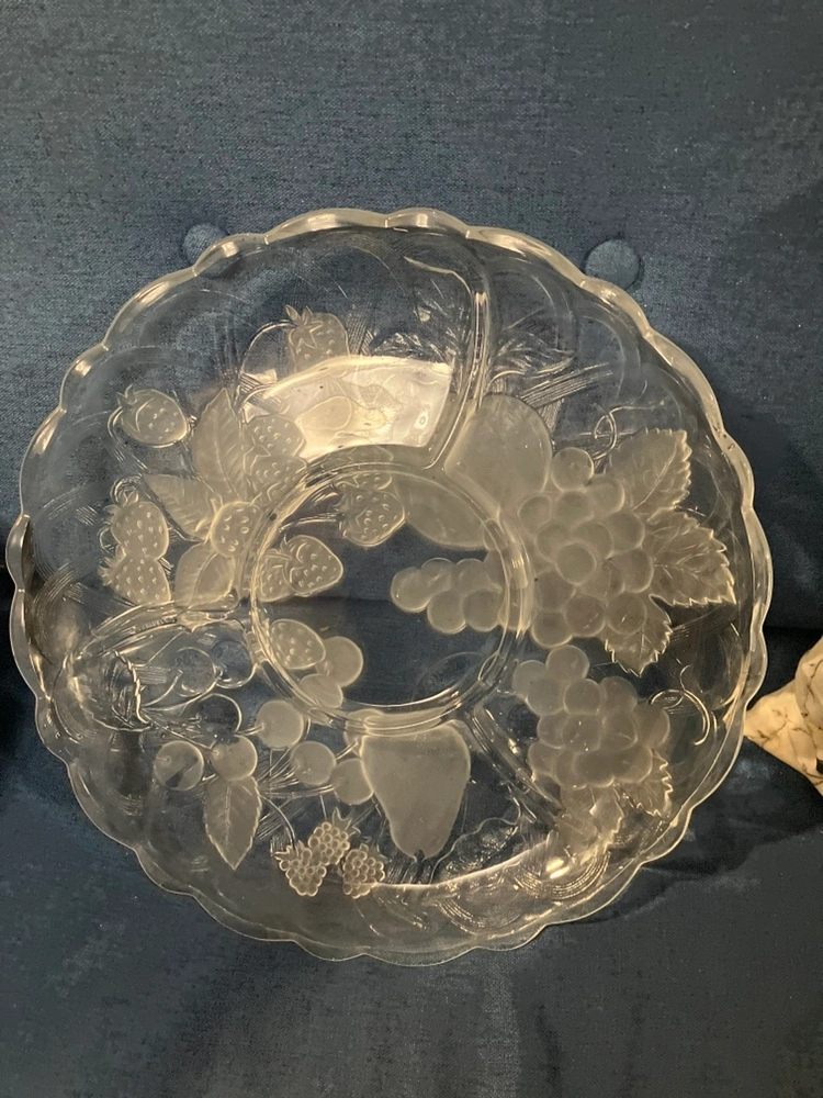 A beautiful glass serving platter with a fruit design. It is perfect for serving snacks, appetizers, or fruit. It is approximately 12 inches in diameter.