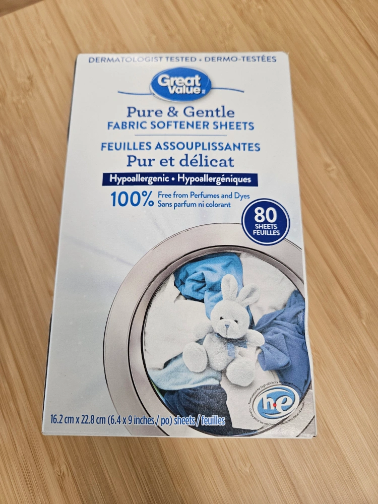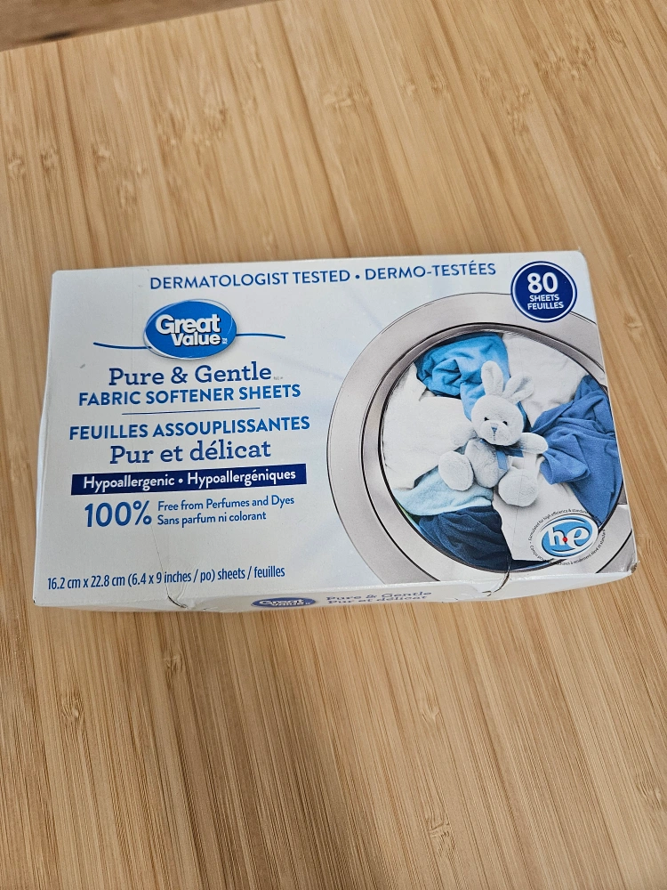 A box of Great Value Pure & Gentle Fabric Softener Sheets. 80 sheets in total.