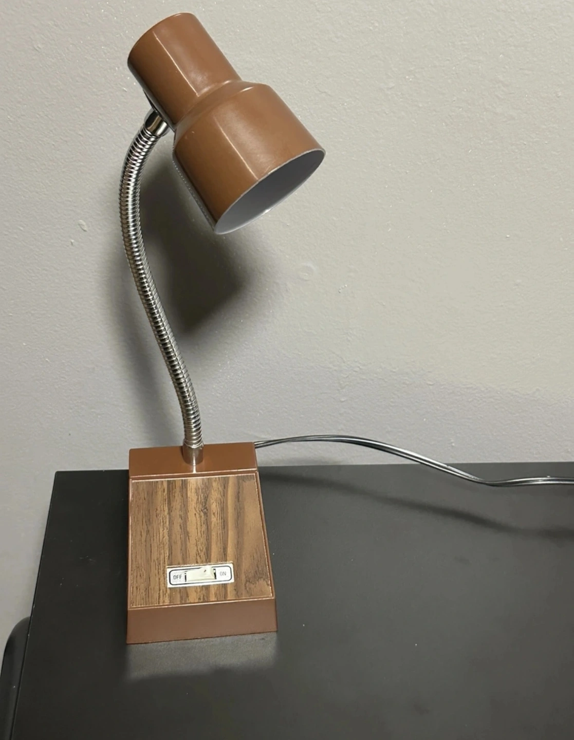 A vintage brown desk lamp with a flexible neck. It has an on/off switch on the base and a standard light bulb socket. The lamp has a brown metal shade with a white interior. The base is made of plastic with a wood-grain design. The cord is black.