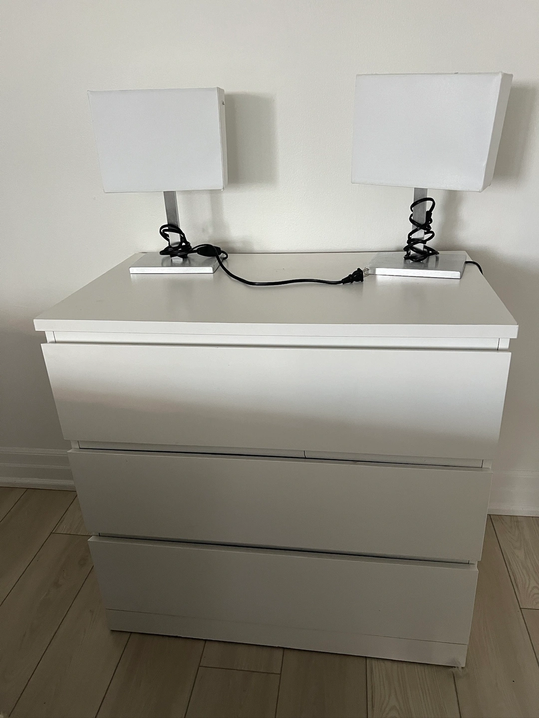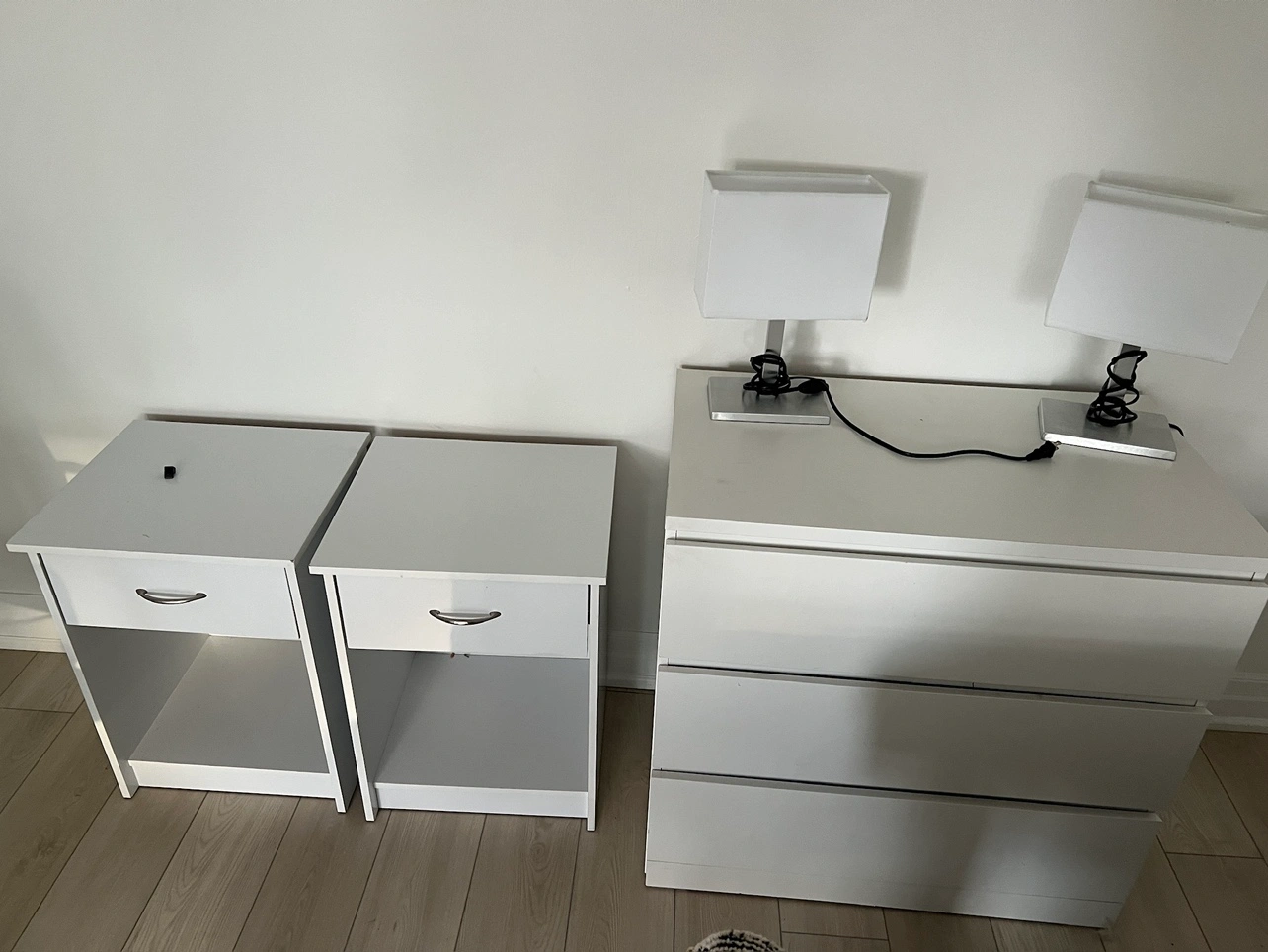 Set of two white nightstands with one drawer each and a matching white dresser with three drawers. Each nightstand is 23" wide x 16.5" deep x 25" high. The dresser is 34" wide x 16.5" deep x 30" high. Also includes two white table lamps with white lampshades. The lamps are 10" wide x 12" high x 7" deep.