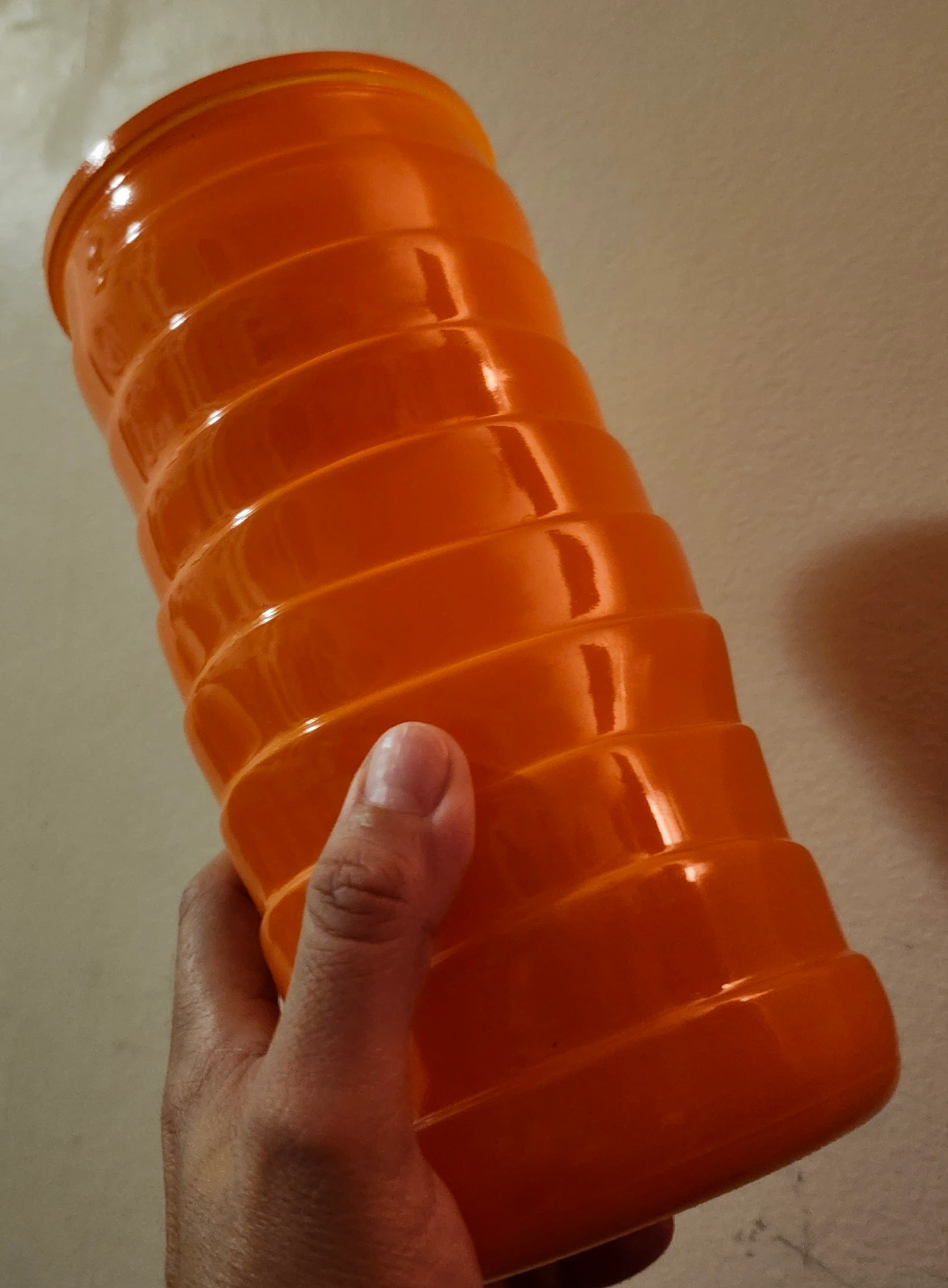 This vase is made of sturdy orange glass and features a unique ribbed design. It is a great size for any use. It is perfect for use at home #freecycle #cyclefree pick up on the weekend only. thank you