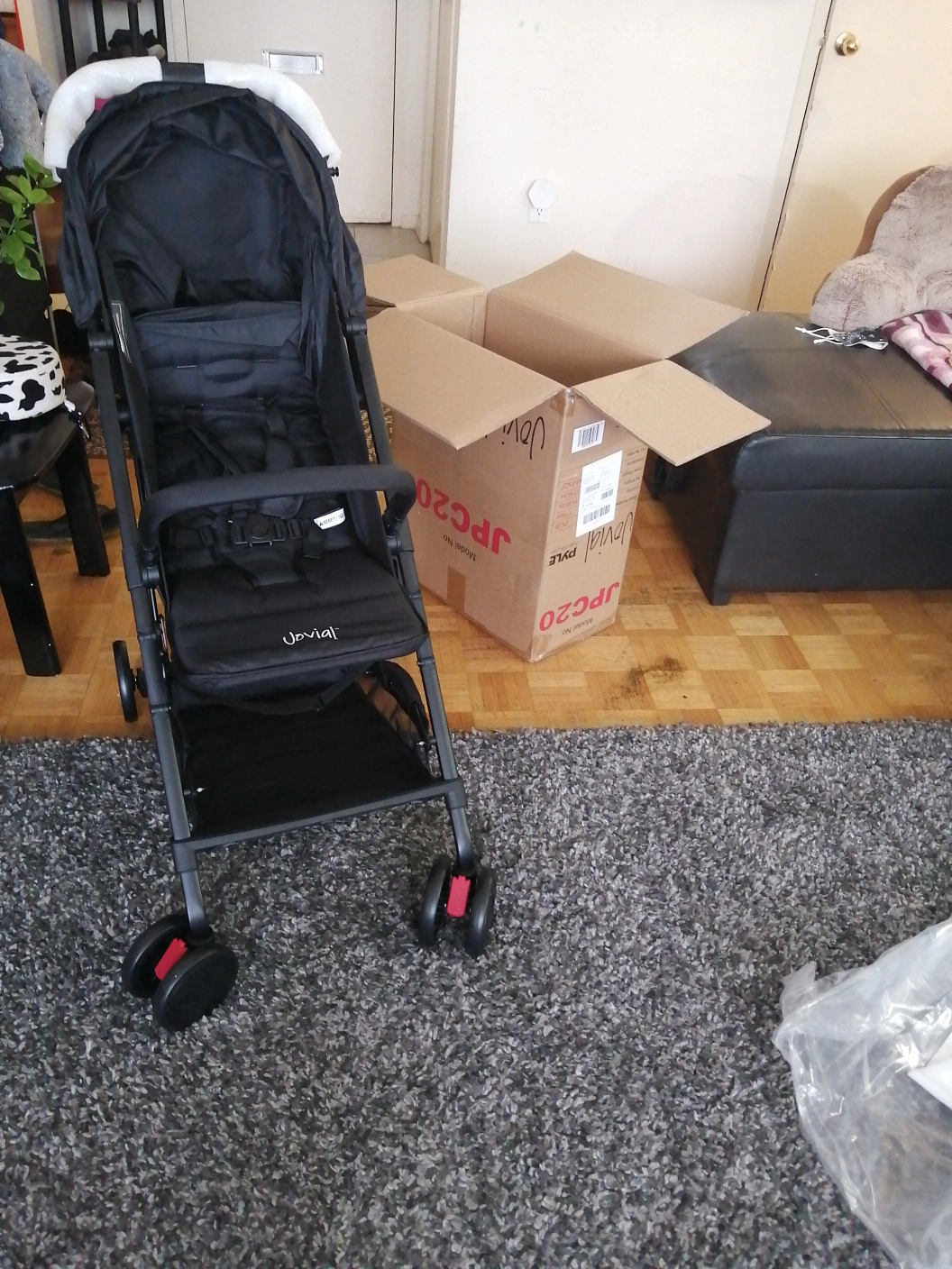 Black Jovial stroller. very smooth movement, Comes with a storage basket underneath and an adjustable canopy. Has a 5-point harness to secure your little one. It folds compactly for easy transport and storage.
