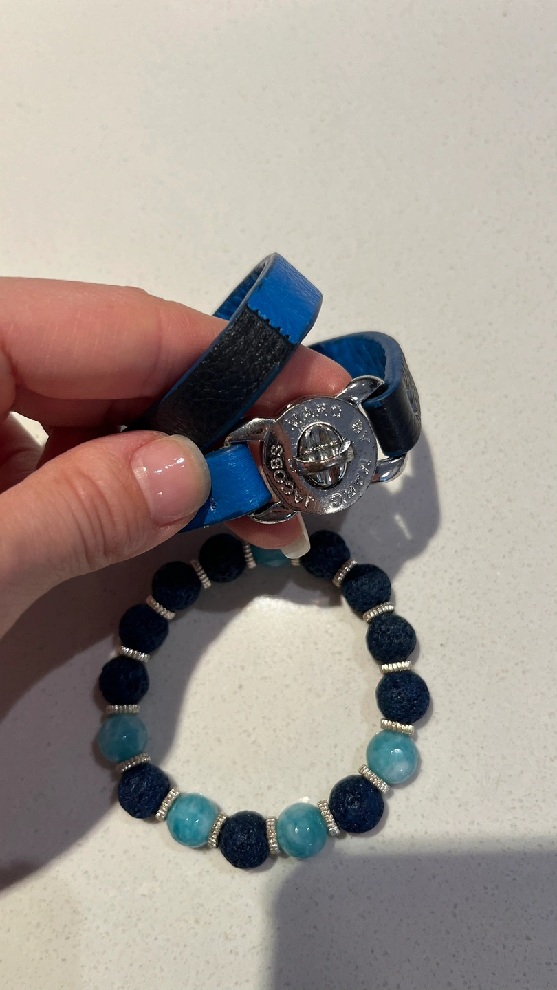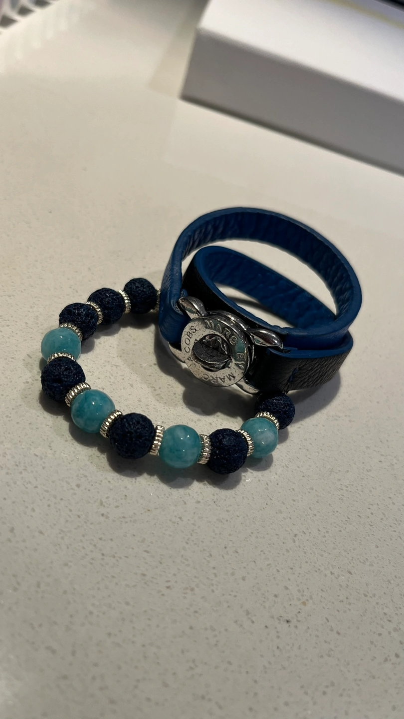 Two bracelets - one leather, one beaded. The leather bracelet is Marc Jacobs . The beaded bracelet features blue beads and lava rock. Both bracelets are blue in colour.
