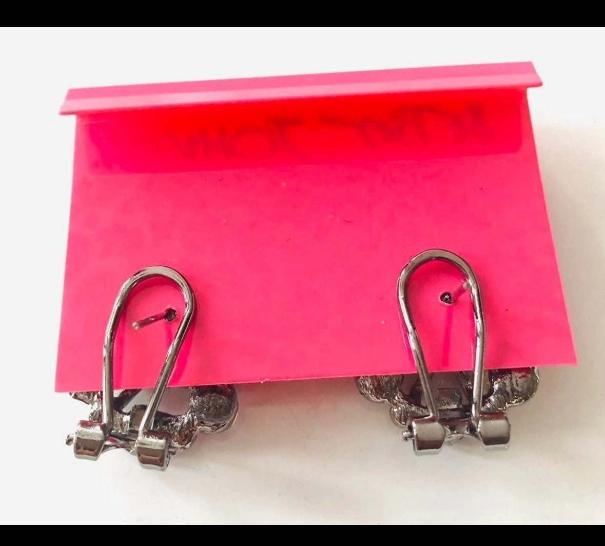 These earrings are in the shape of a heart with rhinestones/crystals surrounding the heart and a bow.